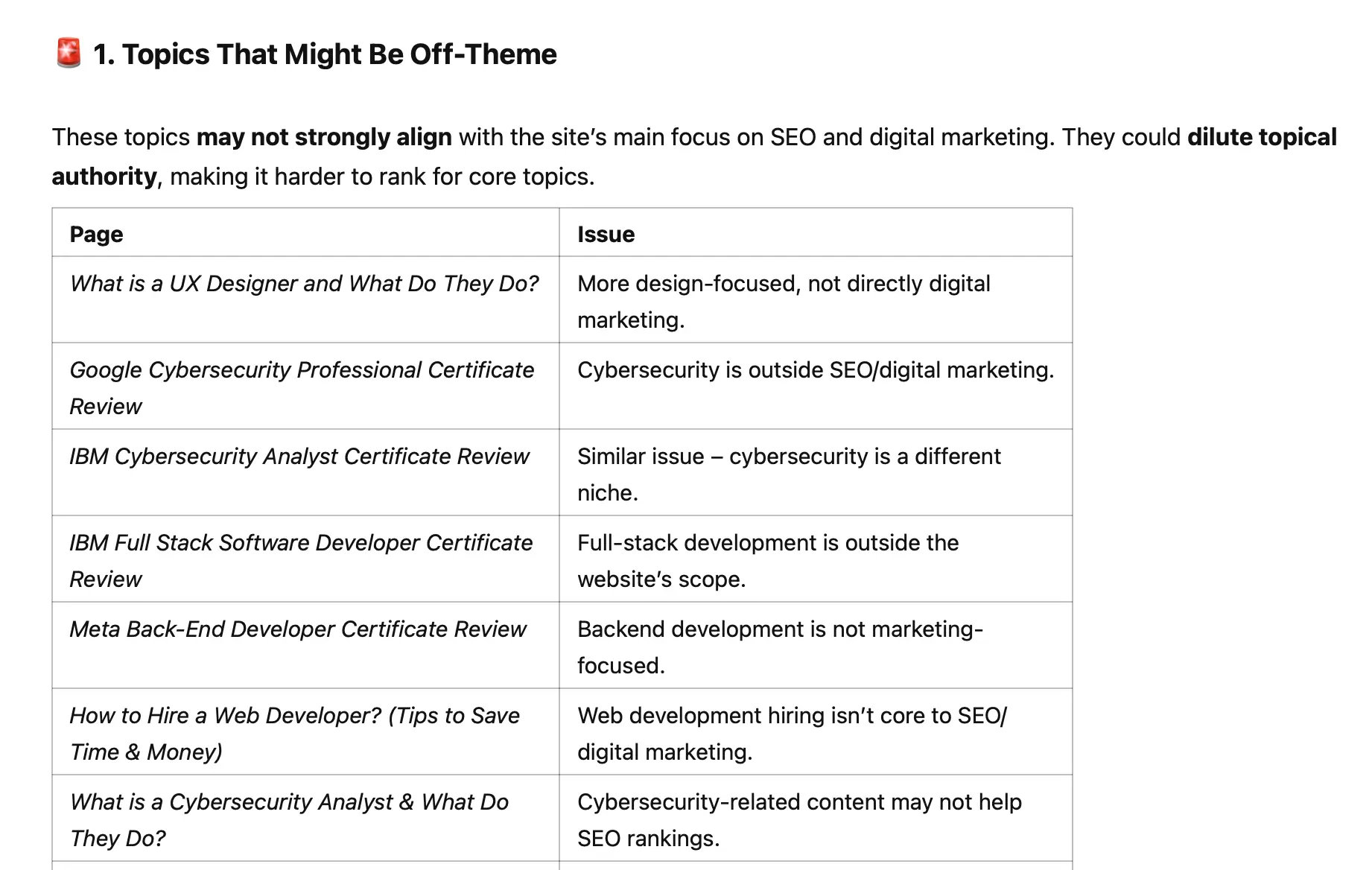 If you’ve published off-topic content just because it had high search volume or was easy to rank for, you’re damaging your site’s authority and dragging your overall website rankings down.