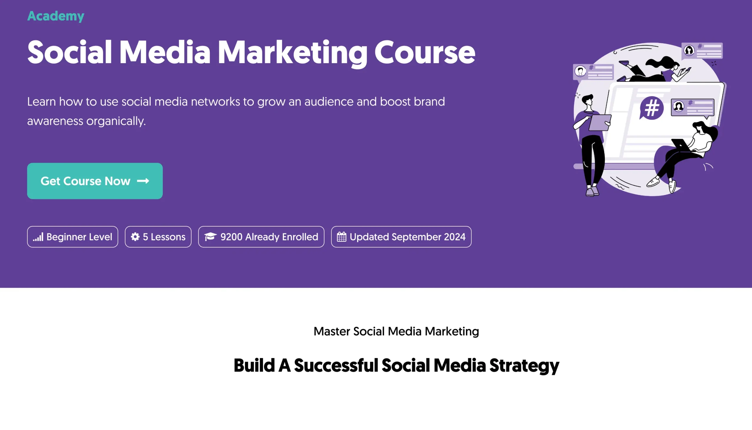 Enrolling in this course gives you access to two social media marketing courses (Social Media Course and Facebook Ads Marketing Course) and 12 more courses covering all major areas of digital marketing (including SEO, Content Marketing, and Google Ads).