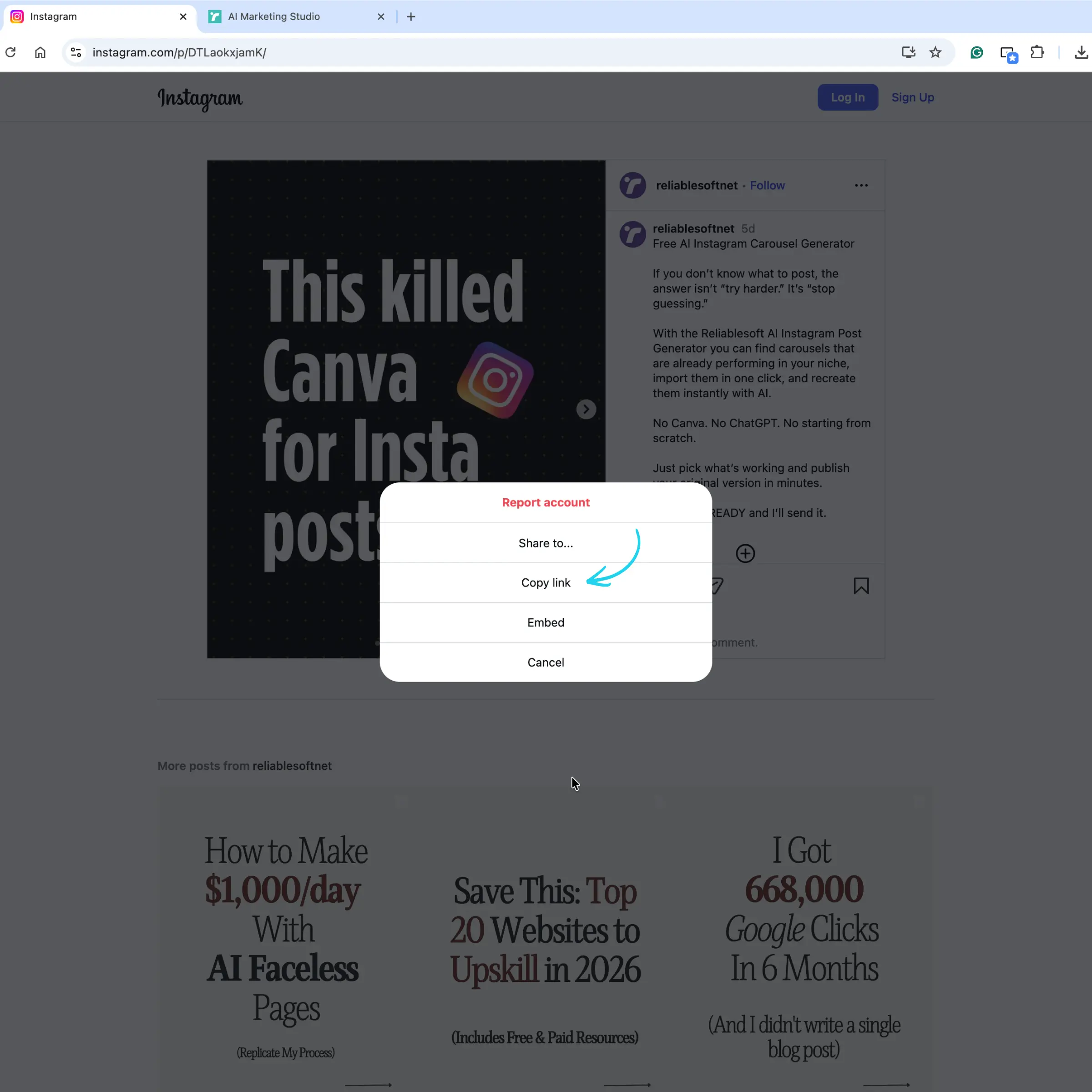 Paste the carousel link into Instagram Carousel Studio. We extract the text, structure and hooks automatically so you can rebuild it instantly.