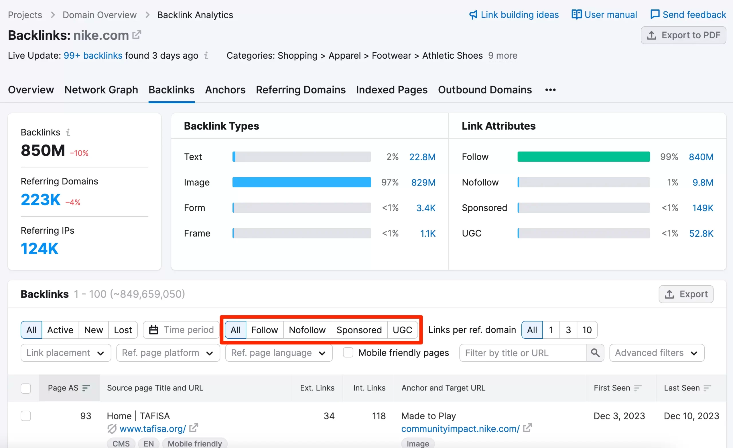 Here is an example of a backlink analysis report from Semrush.