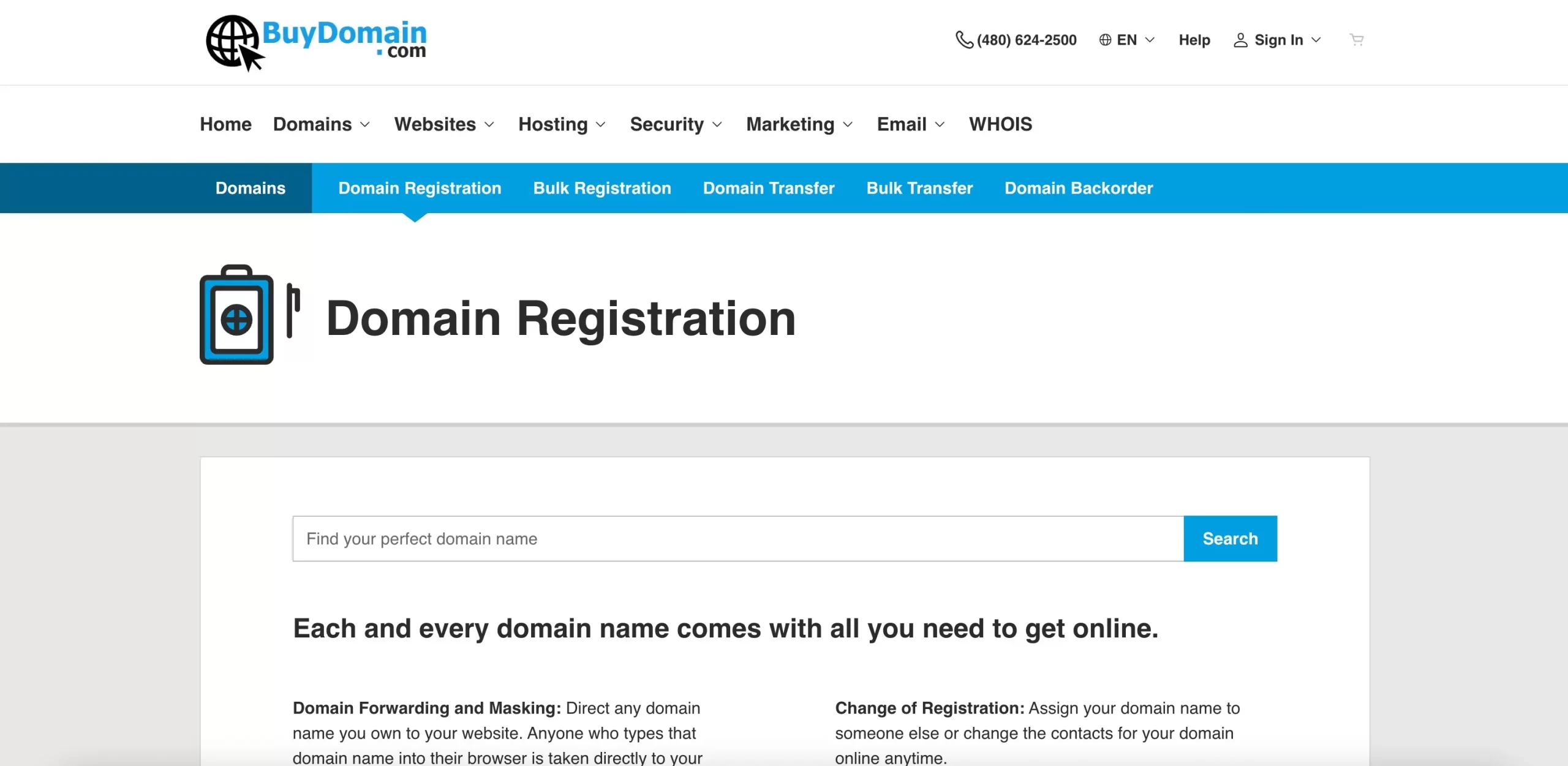 BuyDomain.com allows you to purchase a range of domain names with a wide selection of extensions, including .com, .net, and org. You get basic privacy protection with every purchase, and can even use “bulk registration” features to purchase up to 500 domains at once.