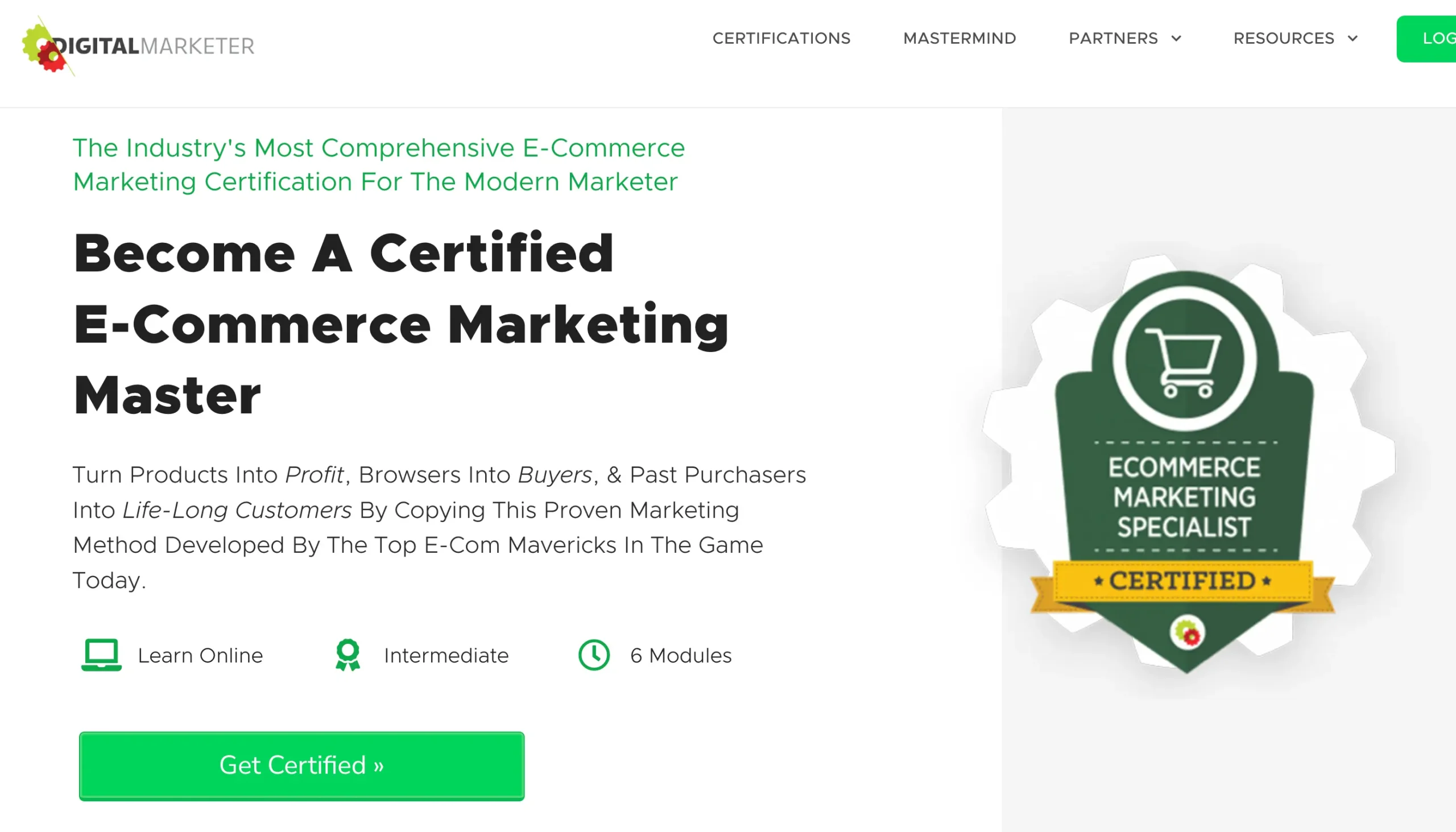 The E-Commerce Marketing Mastery by Digital Marketer is one of the most comprehensive ecommerce certifications you can pursue. It includes 6 lessons and is mainly suited for intermediate users.