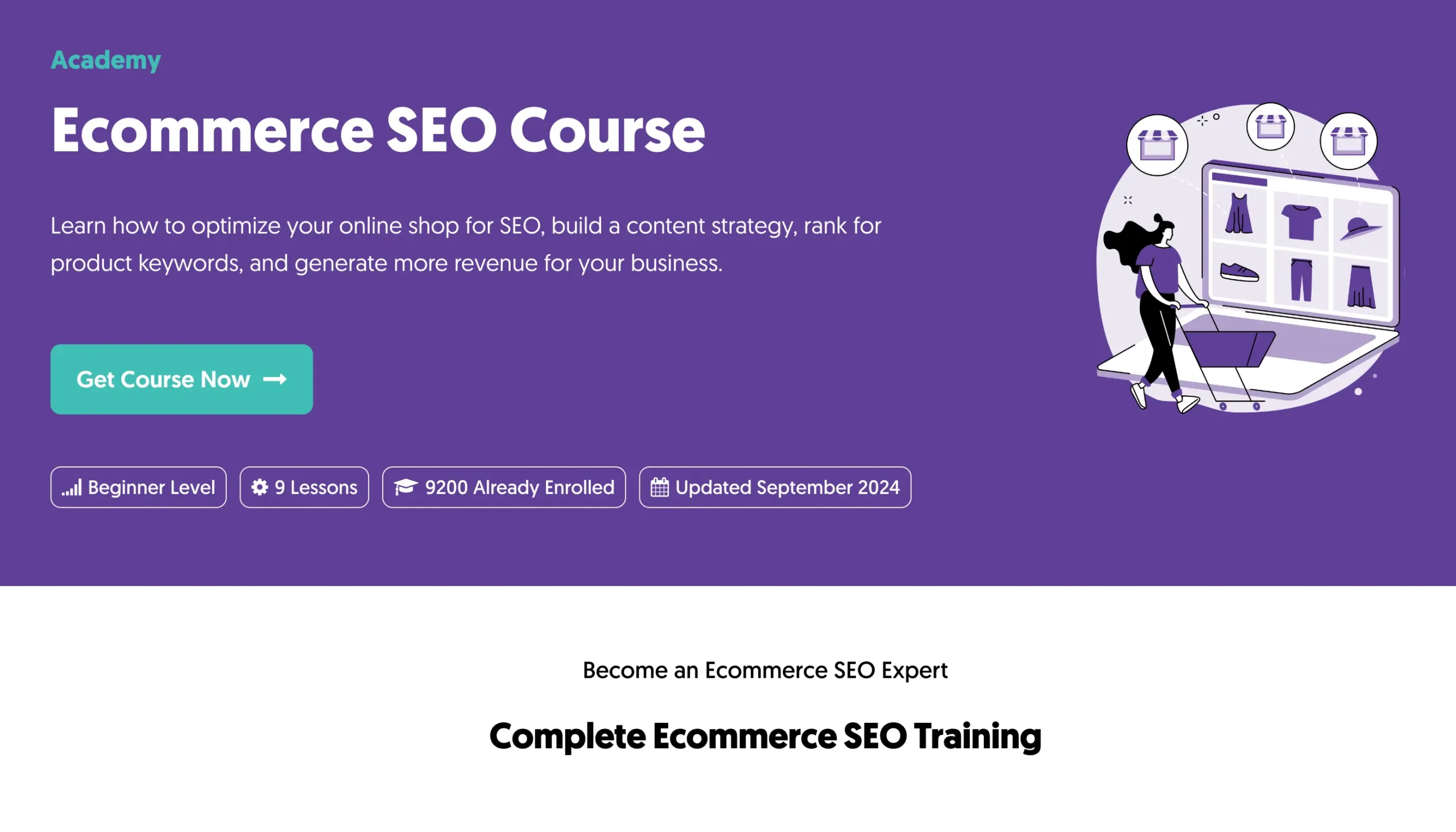 The course has 9 lessons that cover all aspects of eCommerce SEO, including: