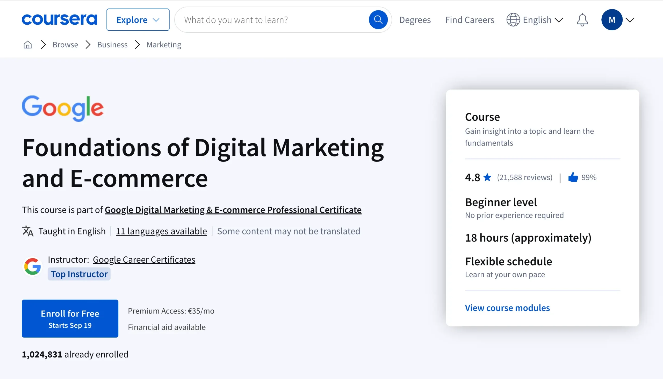 The Foundations of Digital Marketing and E-commerce is another course part of the Google Digital Marketing & E-commerce Professional Certificate.