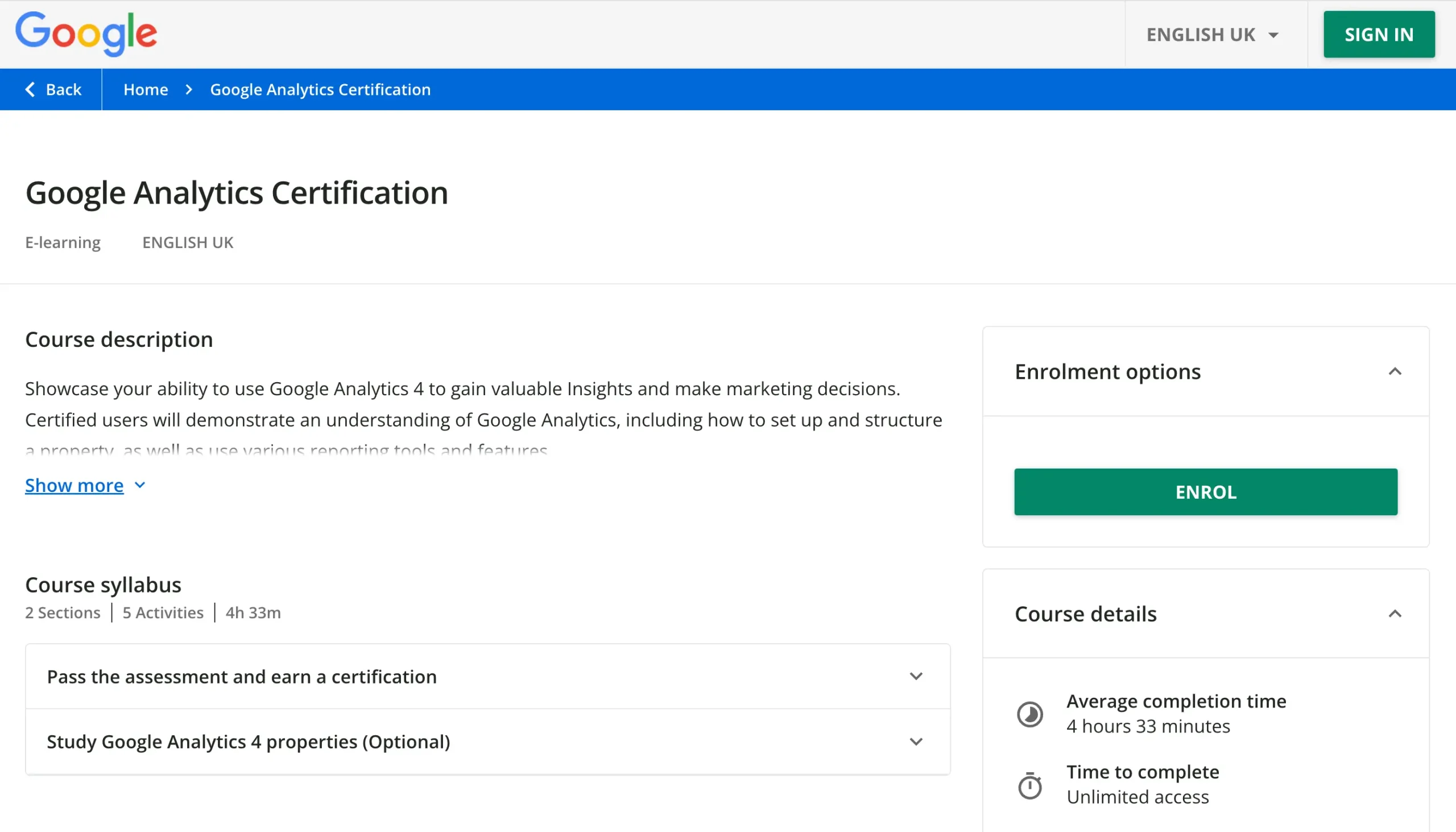 It takes 5 hours to complete and comes with a Google Analytics Certification.