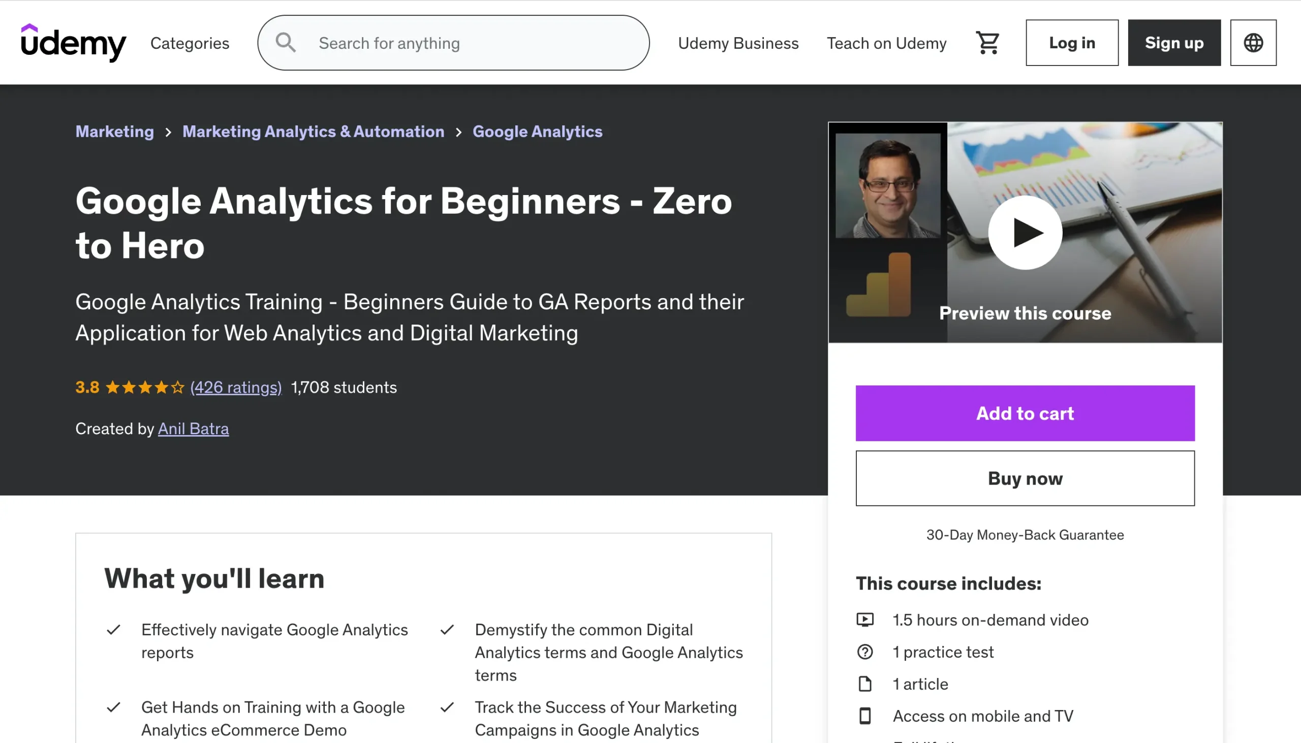 | Google Analytics For Beginners By Udemy | $89.99 | 1.5 hours | Yes |