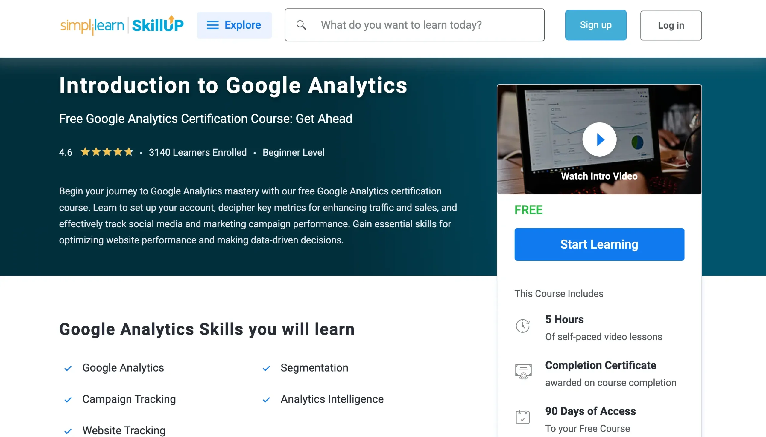 | Introduction to Google Analytics By Simplilearn | Free | 5 hours | Yes |