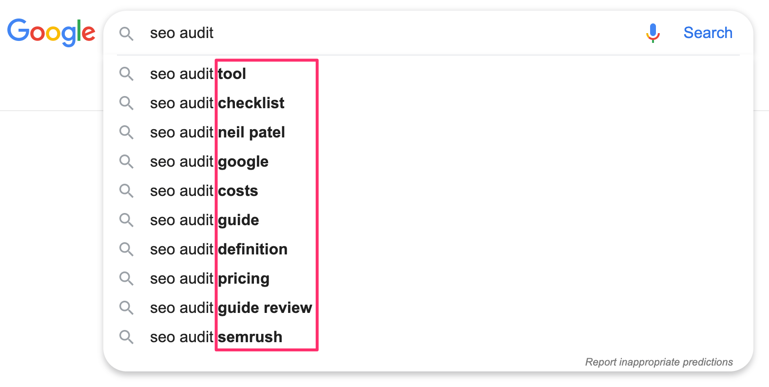 Each time you enter a query into the Google Search bar, the autocomplete feature generates a list of keywords that include the letters/words you have already typed. You can use this list to find new keywords related to your search phrase.