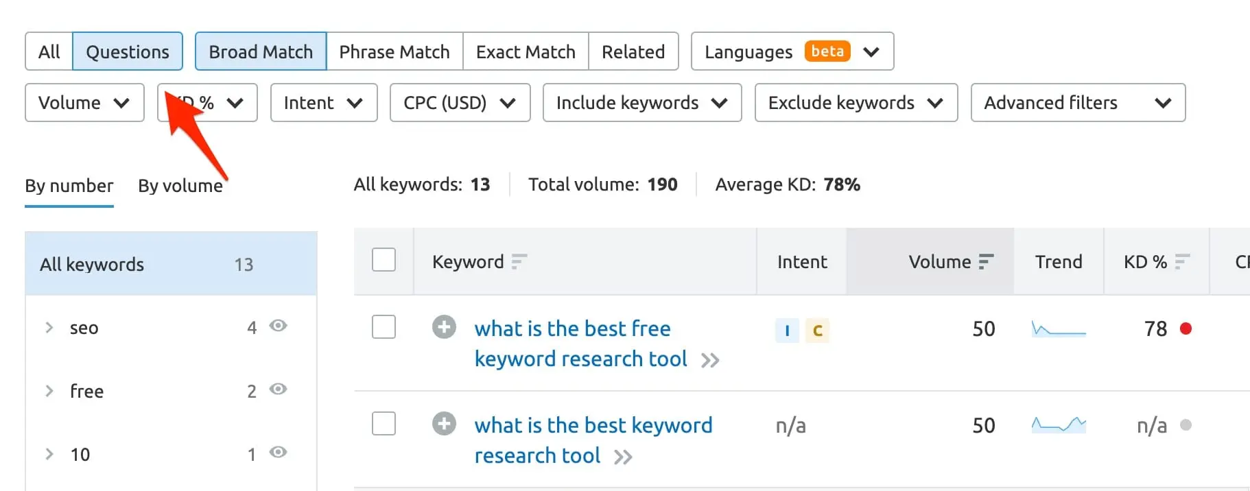 Use the Questions filter to only see keywords in the form of a question. These terms provide great ideas for blog posts and targeting featured snippets.