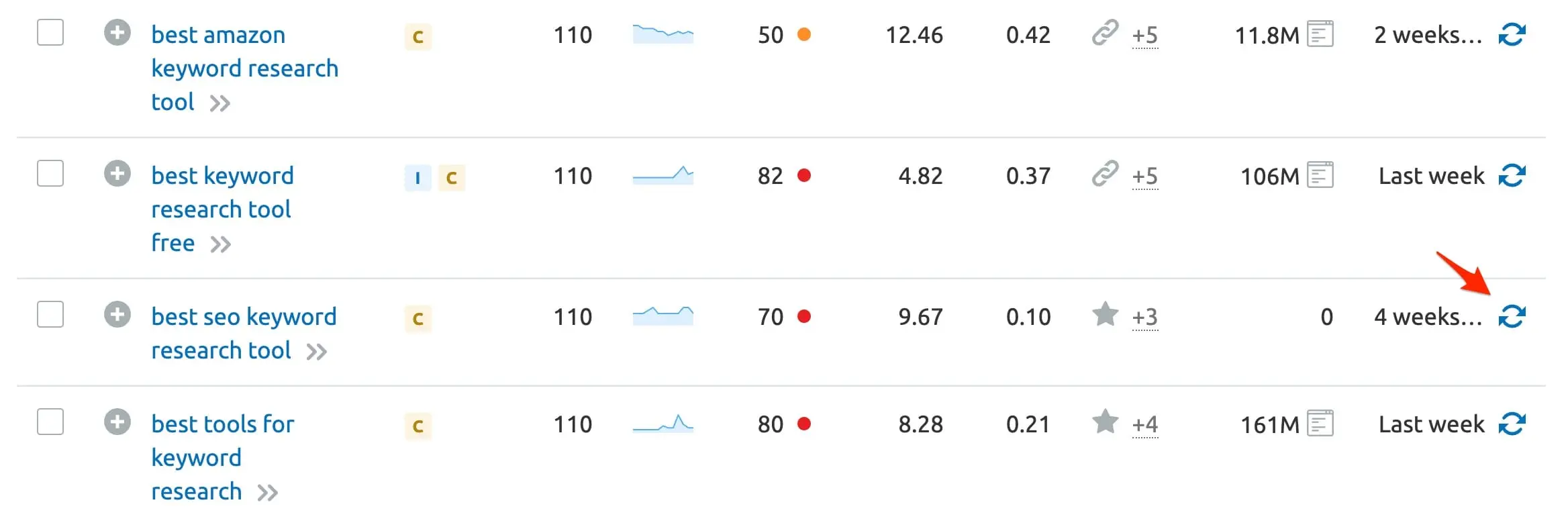 Review the Last Update column and refresh keywords updated over two weeks ago.