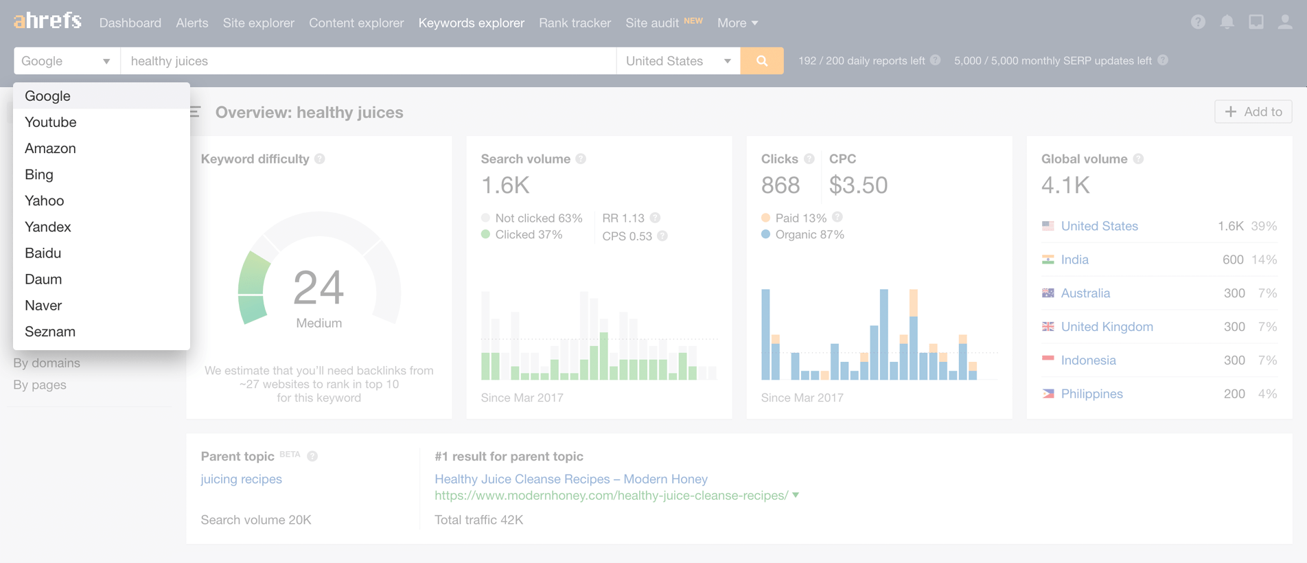 The standout feature of Keyword Explorer is its data quality and support for multiple search engines. You can research terms on Bing, Youtube, Yahoo, and other platforms besides Google.