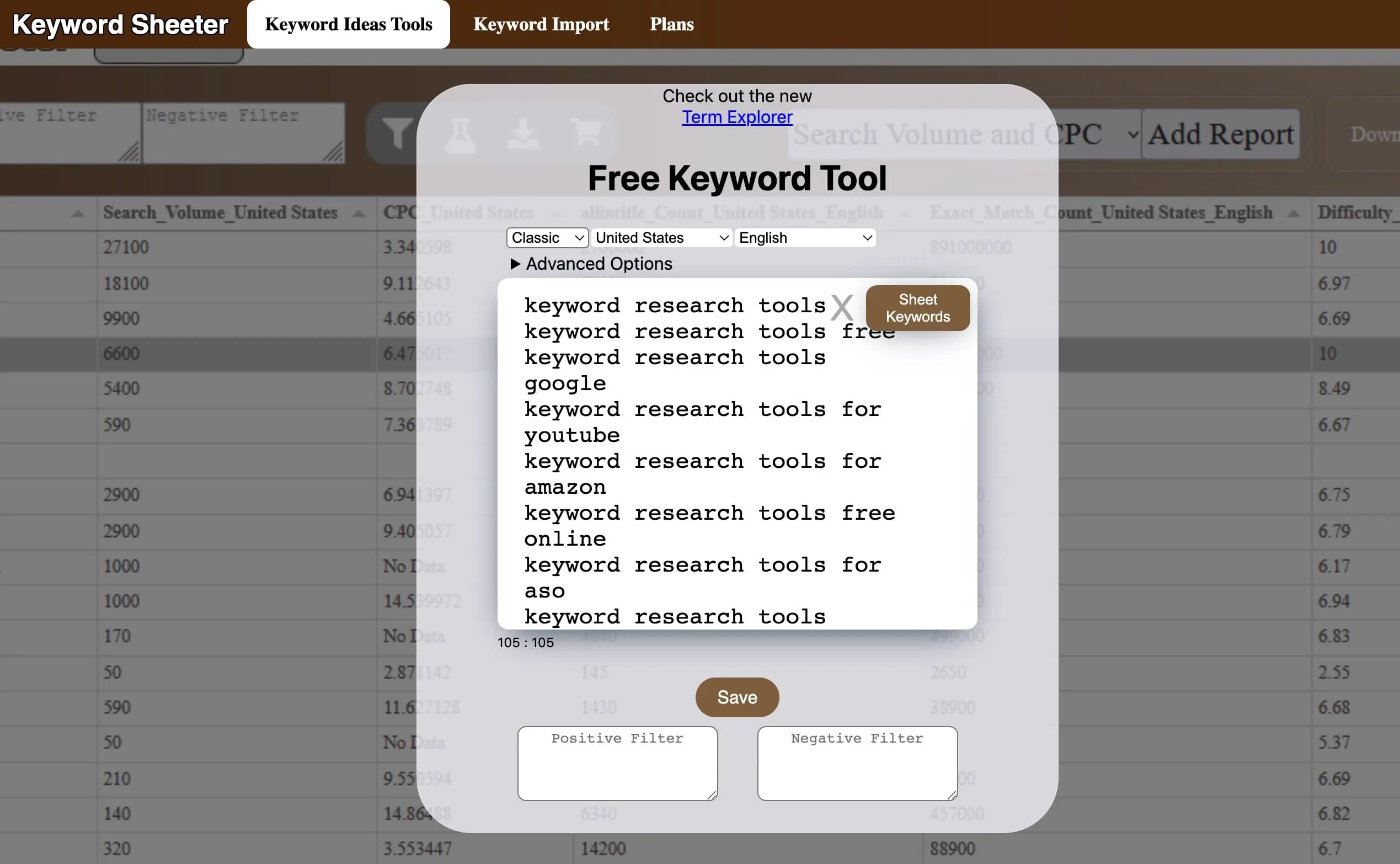 Keyword Sheeter pulls keyword ideas for free. For additional data, you need to purchase “Sheet Coins”. These cost as low as $0.0012 Per Keyword.