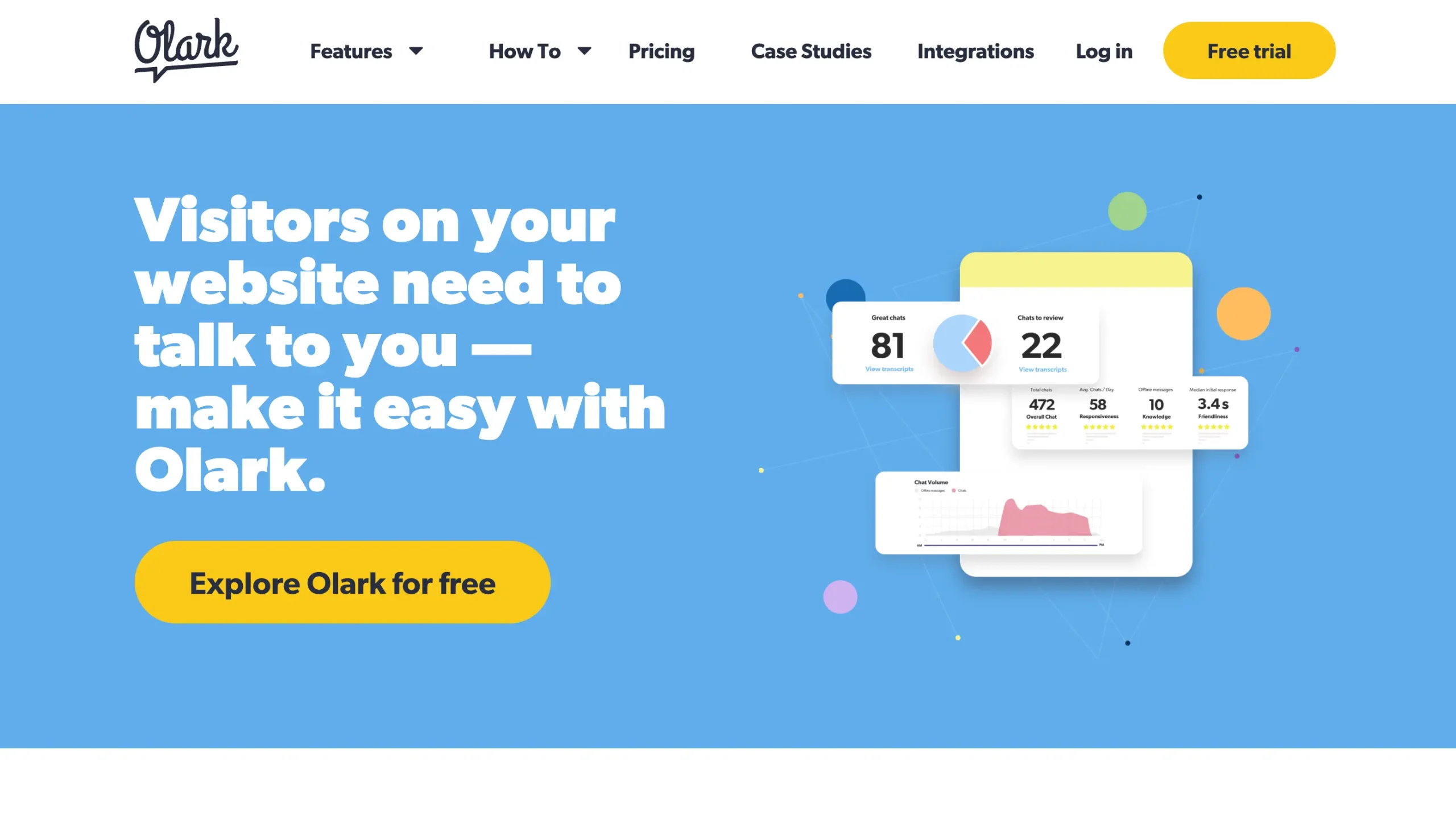 Olark’s unique “PowerUps” allows adding extra features based on your business requirements, such as live chat translation and visitor screen sharing.