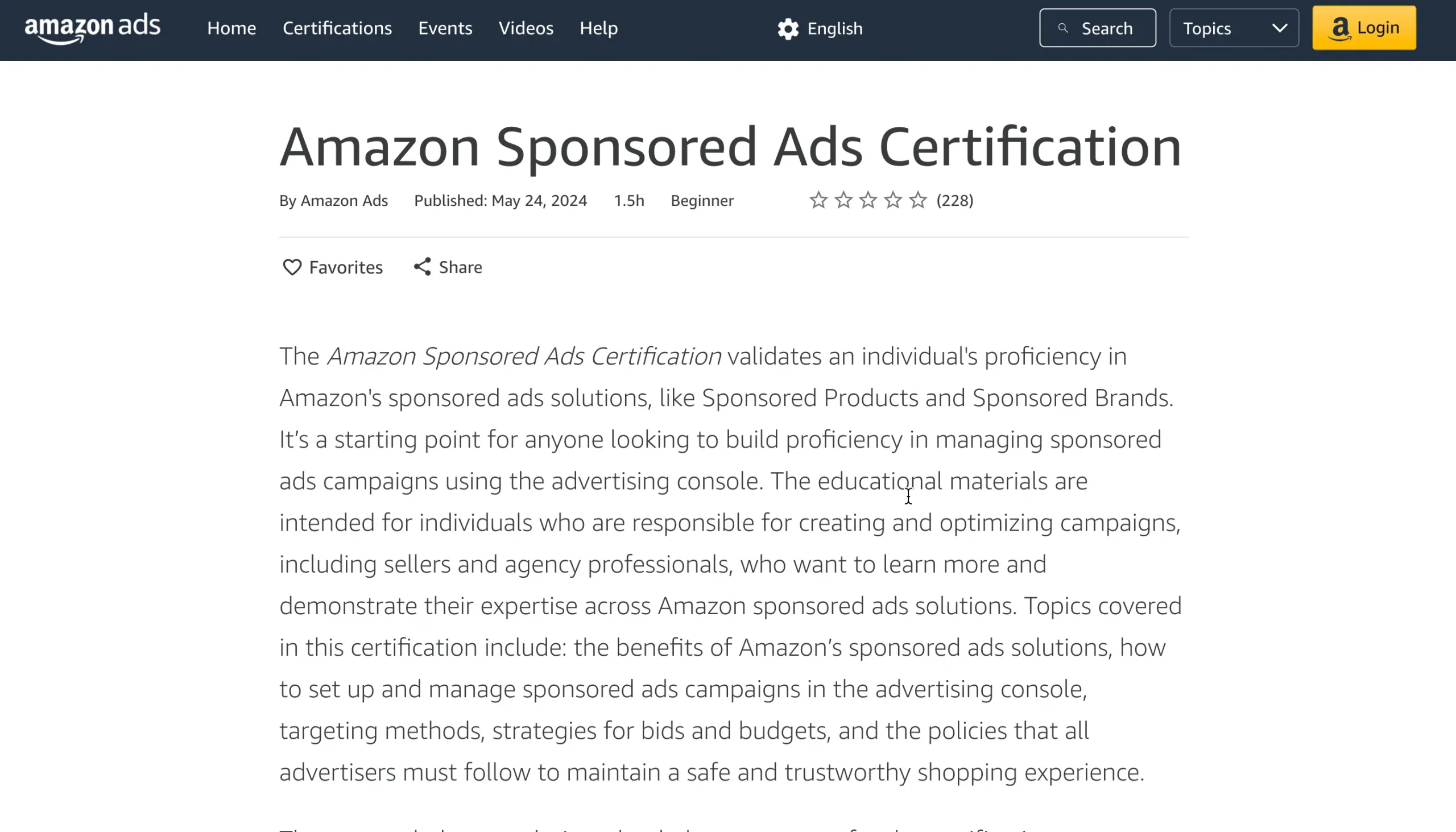 The Amazon Sponsored Ads certification is a free, self-paced course that can be taken at your own pace. You’ll need a few hours to cover all of the content and at least two hours to take the Sponsored Ads certification assessment.