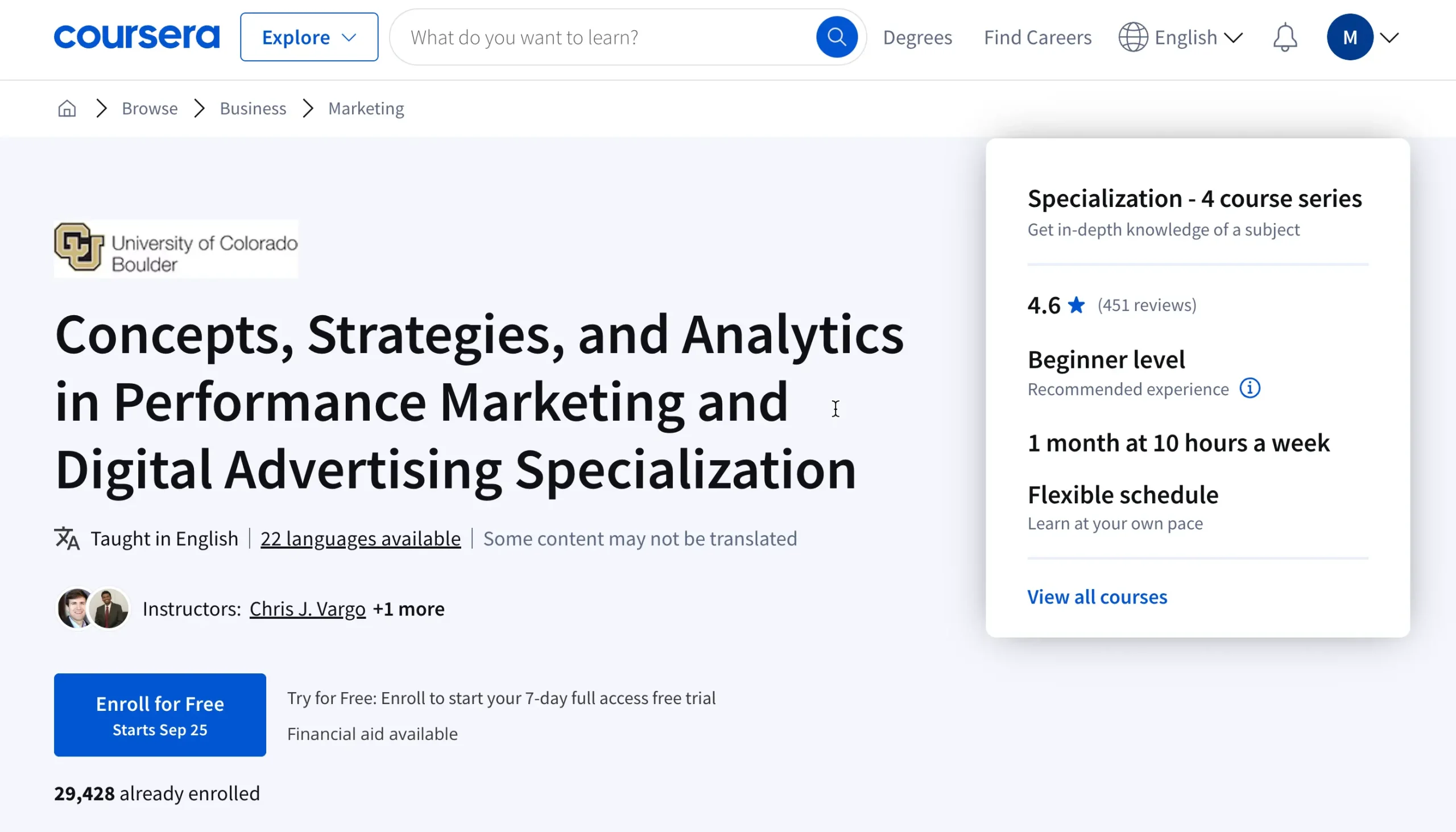 | Coursera Digital Advertising Strategy Certification | $49 | 1 month | Yes |