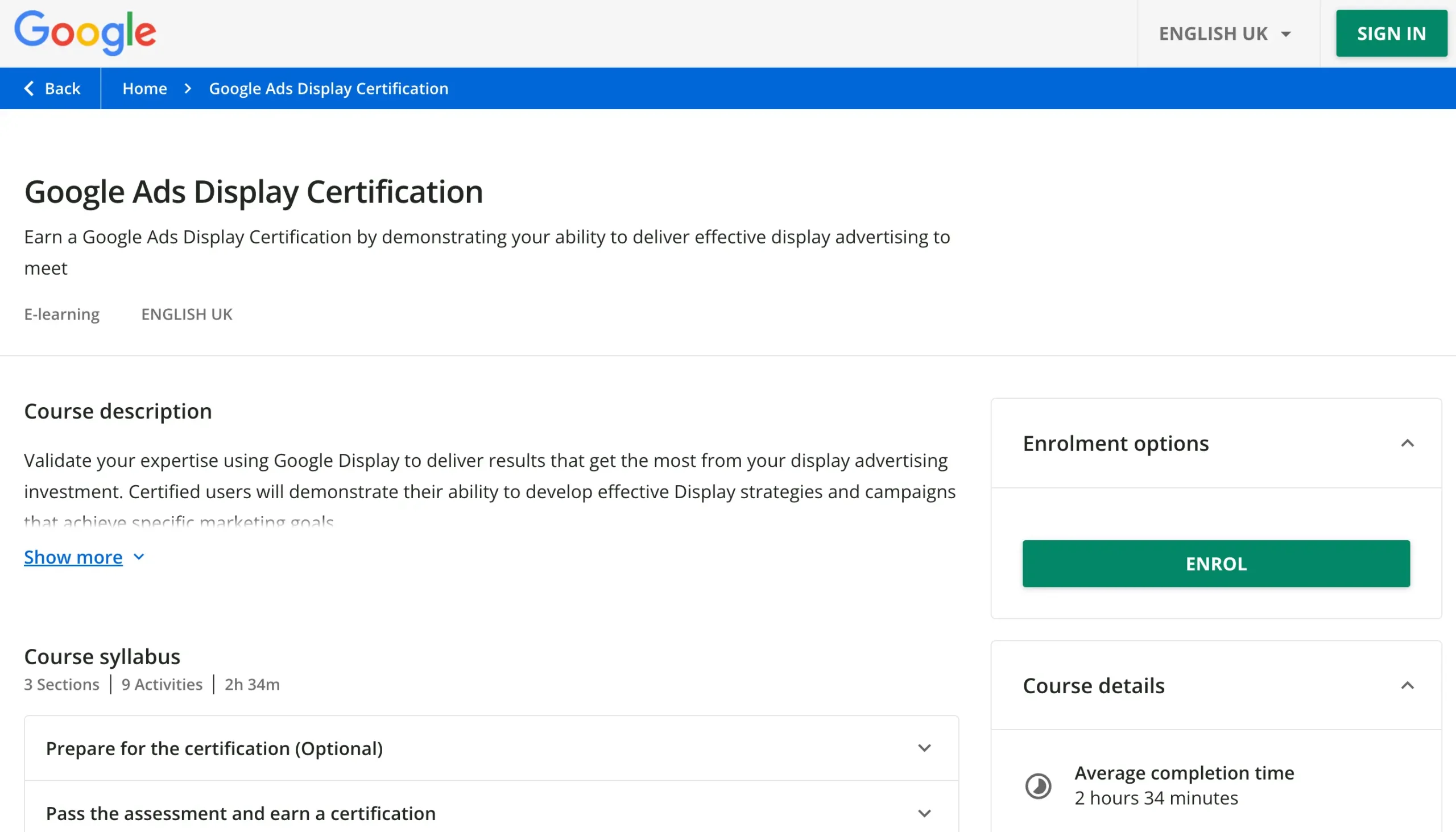 The Google Ads Display certification is a free, self-paced course that should only take a few hours to complete. You must set aside at least 1.3 hours to complete the Google Ads Display assessment to receive your certification.