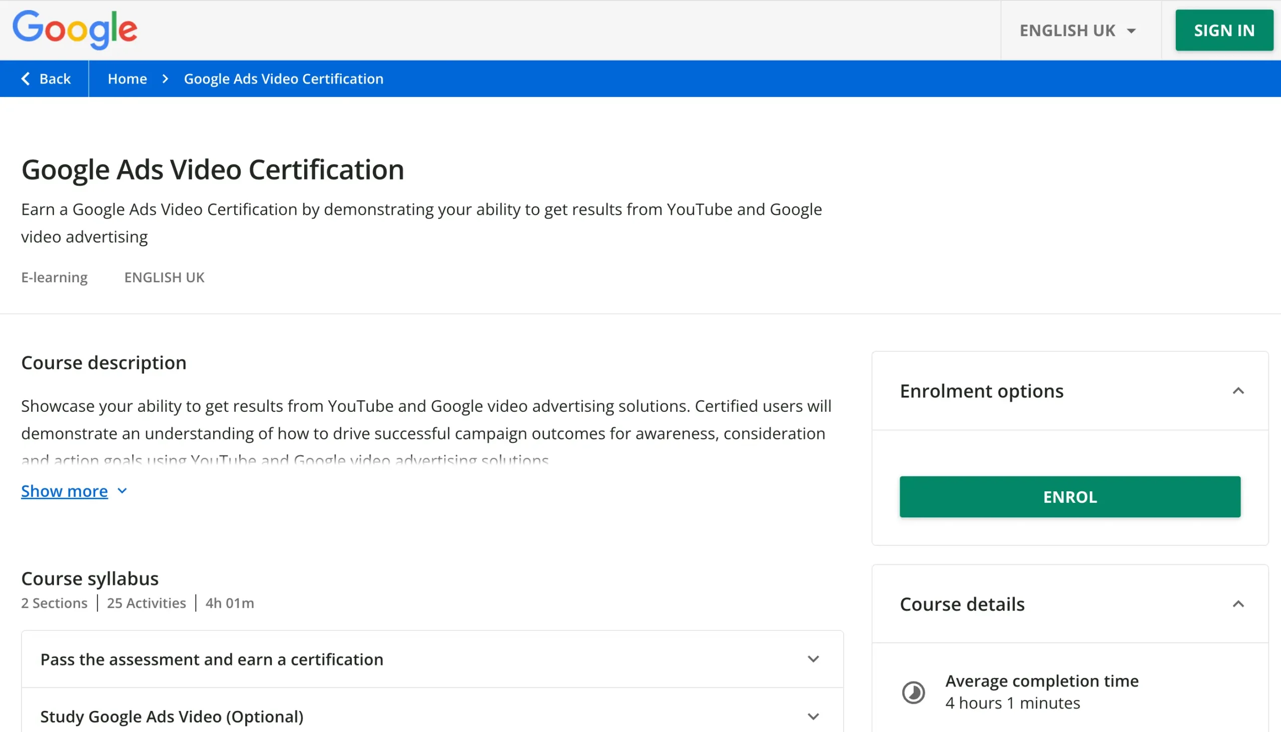 The Google Ads video certification is free to take at your own pace. You’ll be able to complete the course content and take the exam in less than 3 hours.