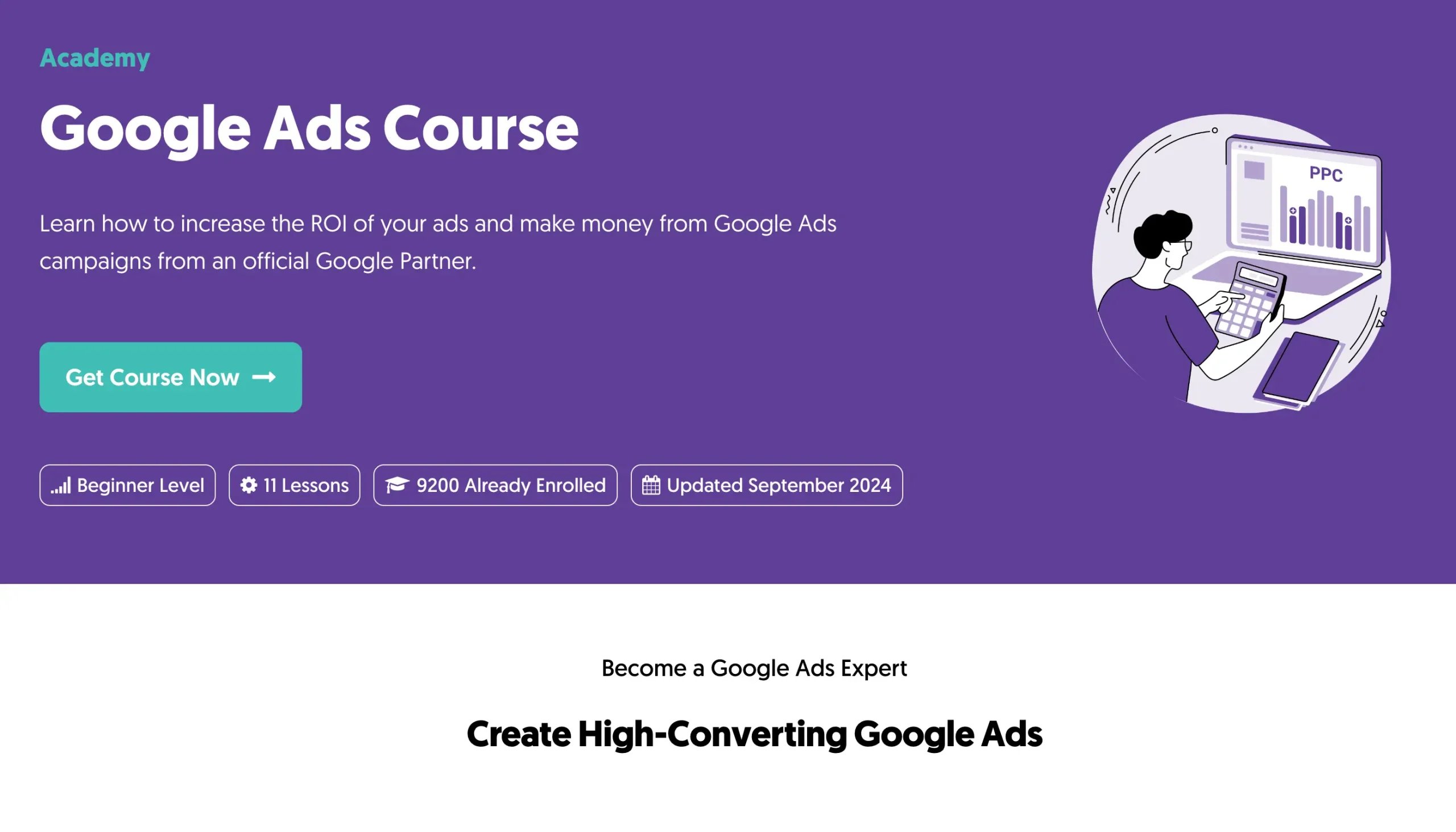 The Google Ads Course by Reliablesoft Academy includes 11 lessons and will teach you how to run profitable PPC campaigns. It starts from the beginning and goes through setting up a new account and enabling conversion tracking.