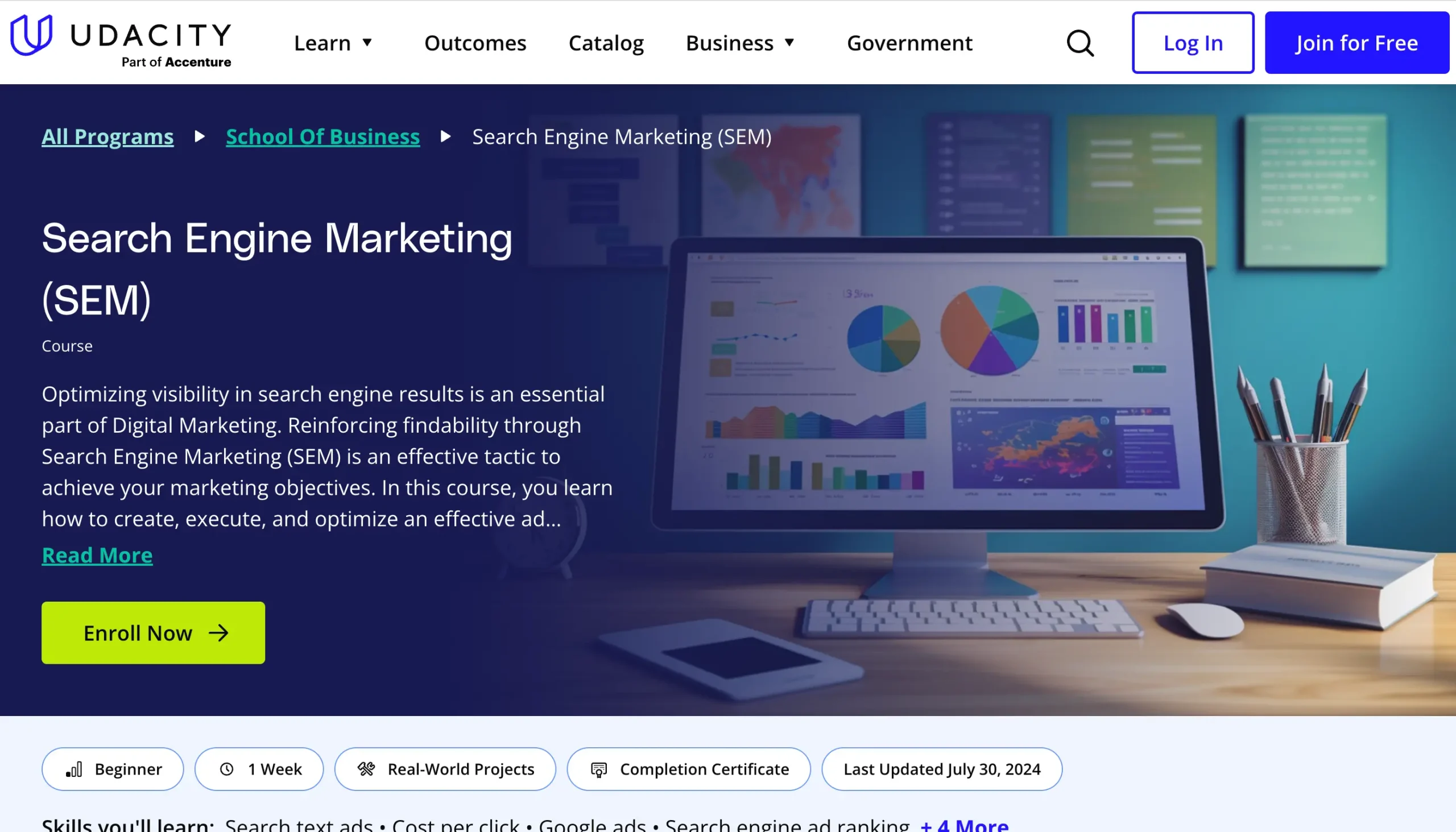 | Search Engine Marketing (SEM) By Udacity | $249/mo | 1 week | Yes |