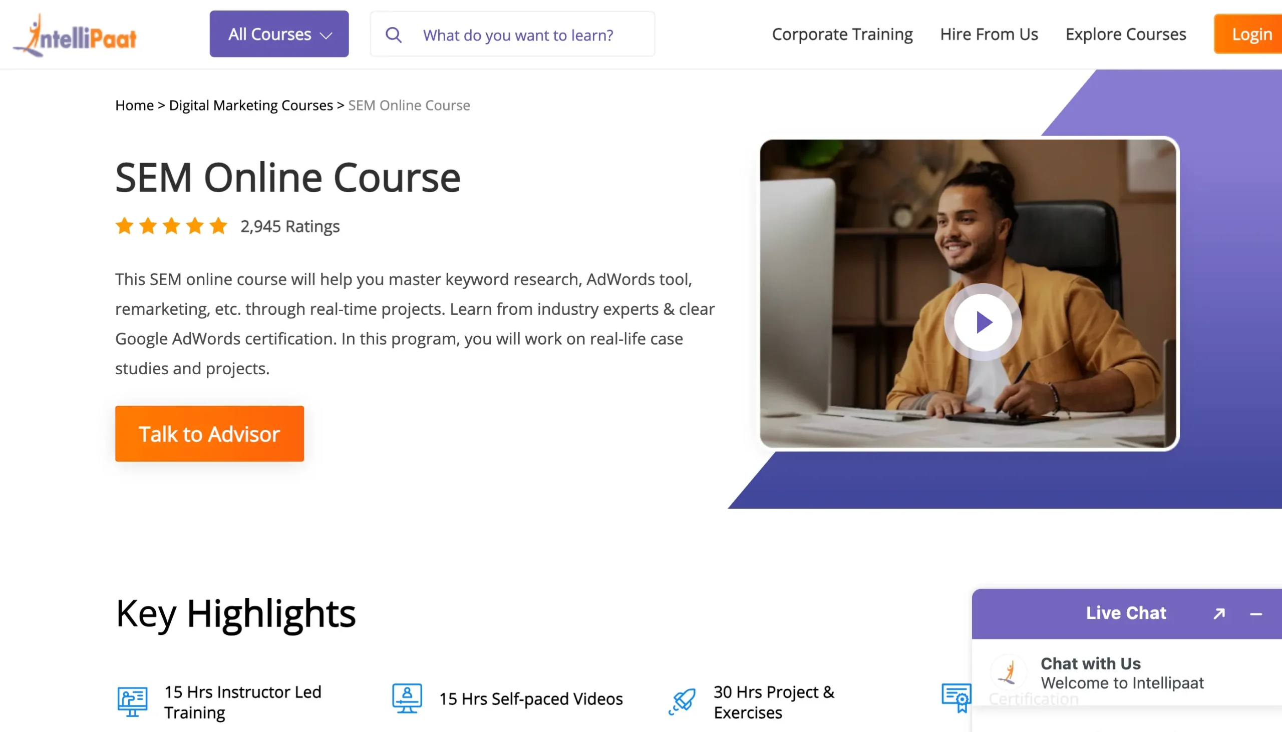 The online SEM training course from IntelliPaat is essentially an end-to-end overview of the most essential components of search engine marketing. As part of the training experience, you get 30 hours of projects and exercises and 15 hours of videos which you can watch at your own pace.