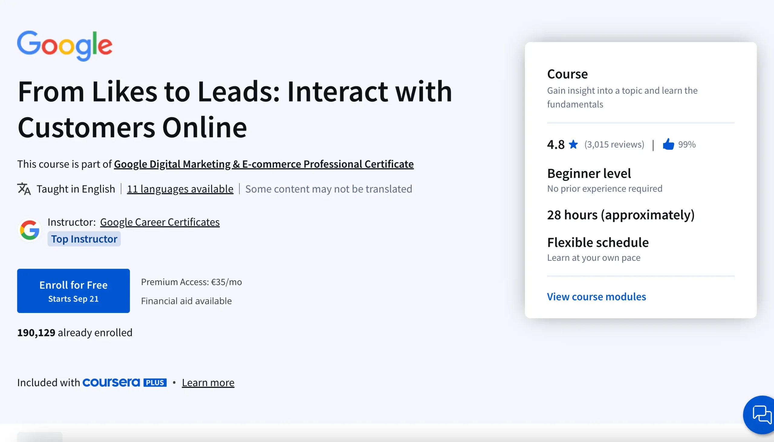 From Likes to Leads: Interact with Customers Online is a Google course part of the Google Digital Marketing & E-commerce Professional Certificate.