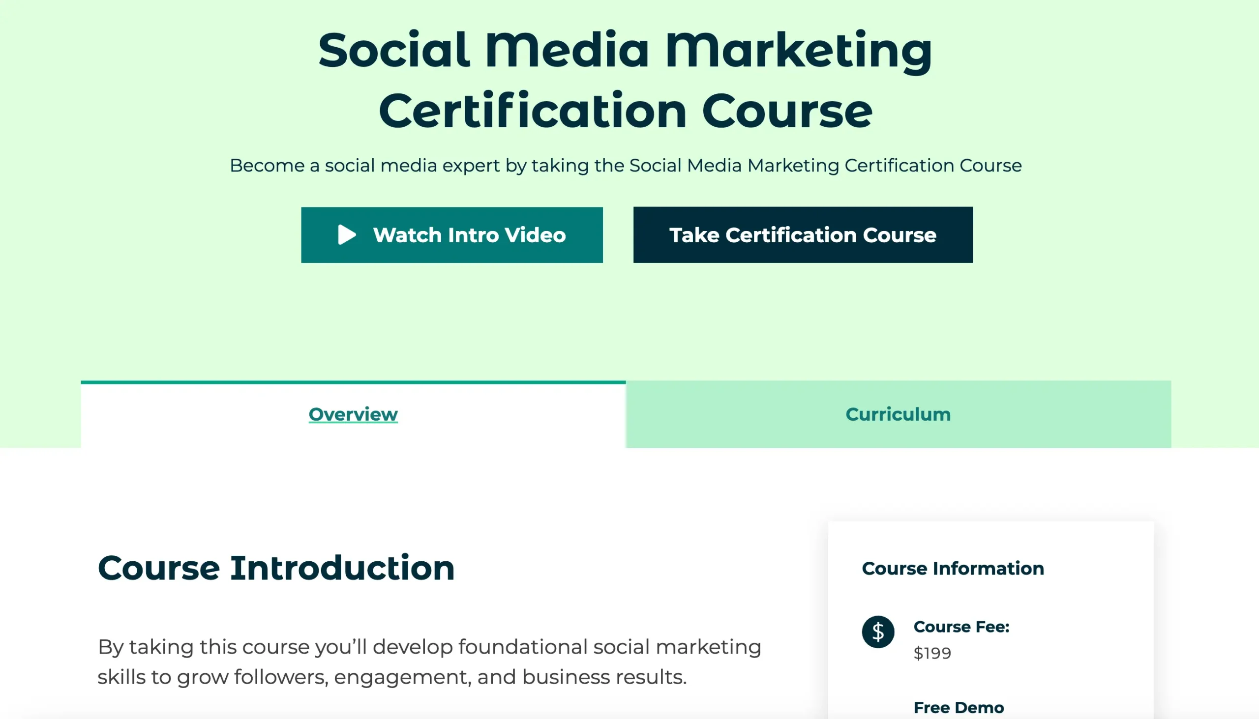 The Social Media Marketing Certification course also has modules for growing a social media team, so it’s perfect for an individual or a social media team leader. Plus, it’s free to follow the lessons without risk.