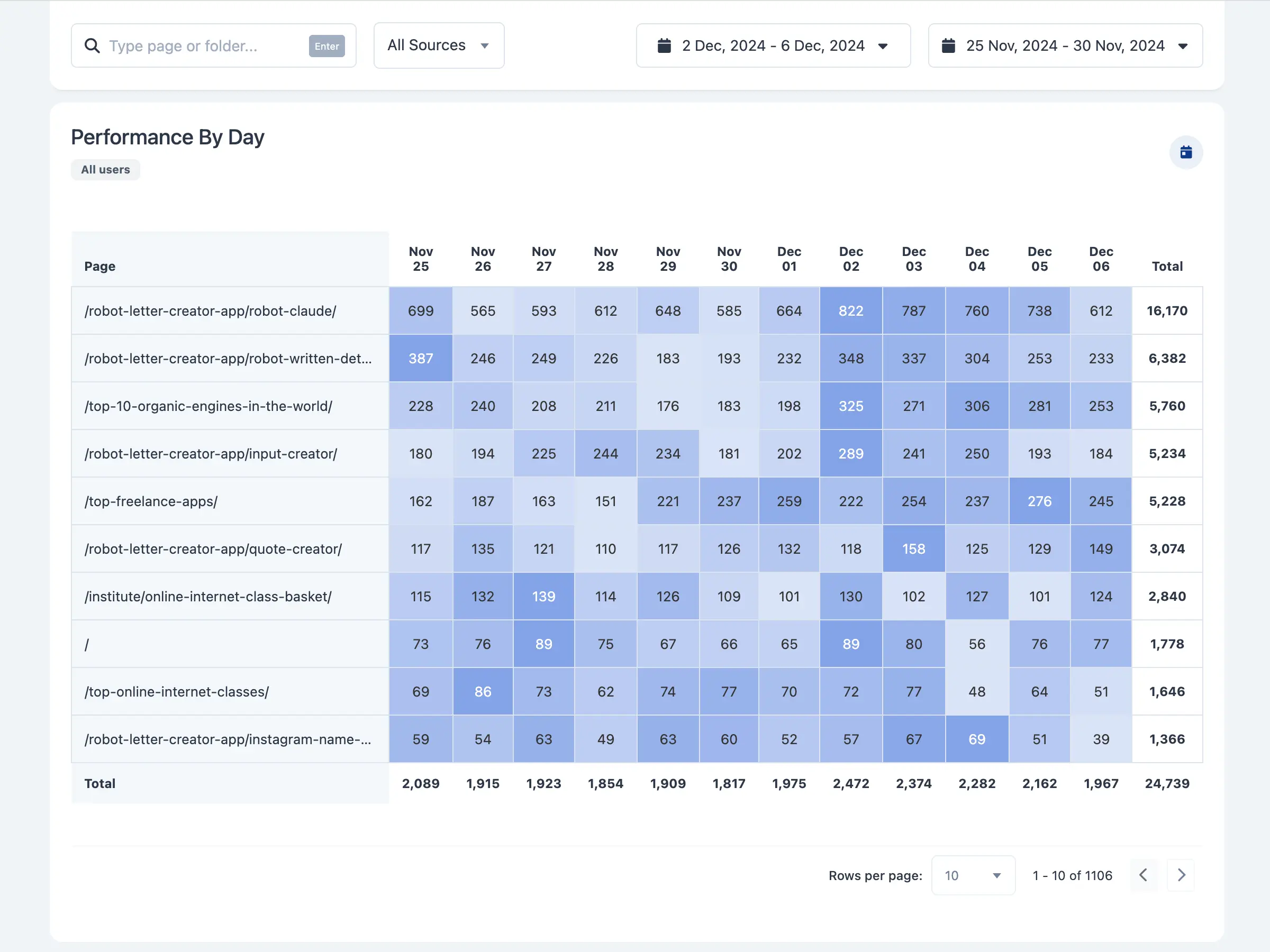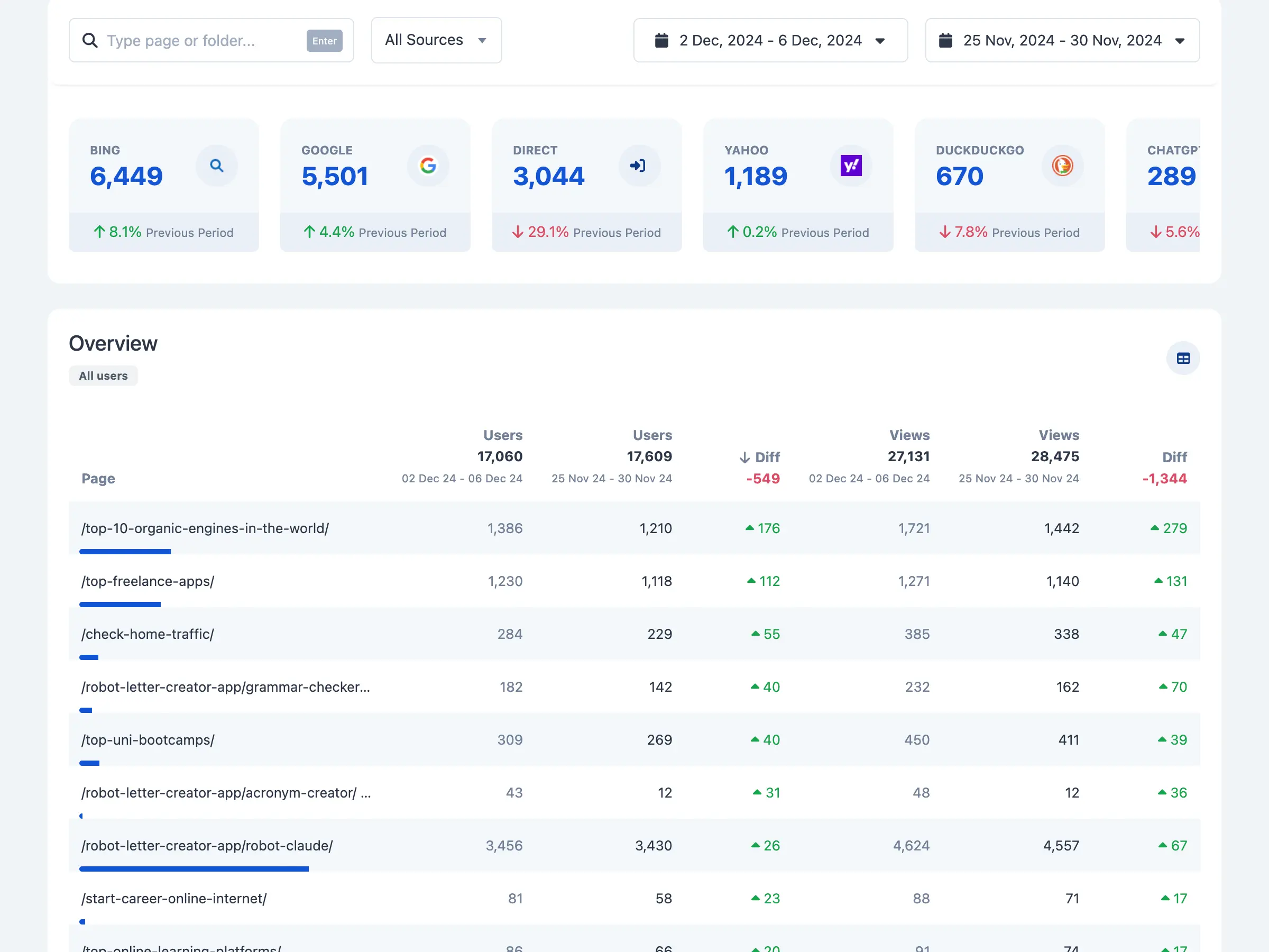 - Traffic by sources: See how much traffic comes from each channel along with its percentage of total traffic.