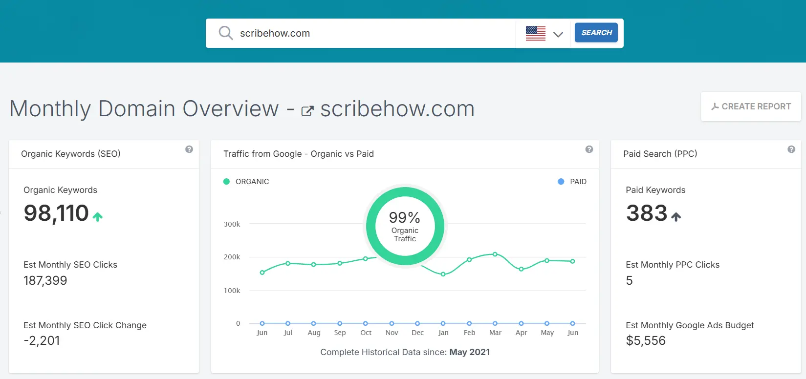 As a website traffic checker, SpyFu allows you to analyze how much traffic a site receives from both organic and paid search, which keywords drive that traffic, and how performance trends have changed over time.