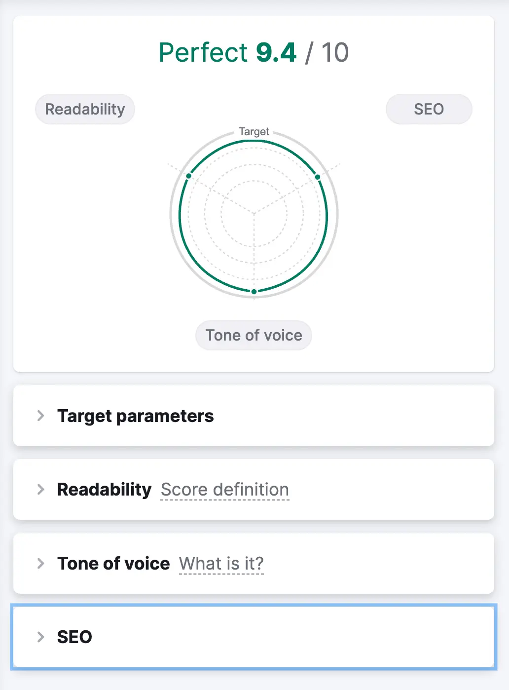 While working on the text, you can also view the Optimization score of the article. This value is from 1 to 10 based on the readability, tone of voice, and SEO optimization.
