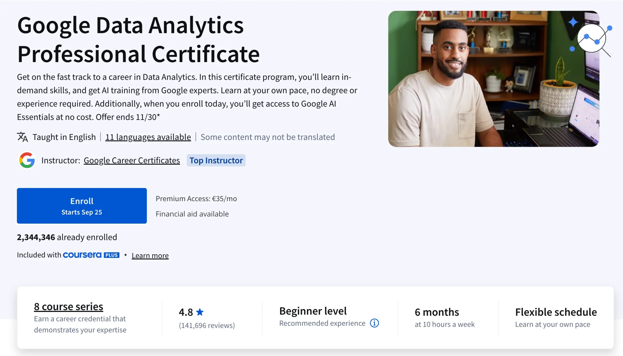 It's a comprehensive course that takes less than six months to complete and can help you secure an entry-level position (as a Data Analyst, Junior Data Analyst, or Associate Data Analyst) through Google’s Employer Consortium.