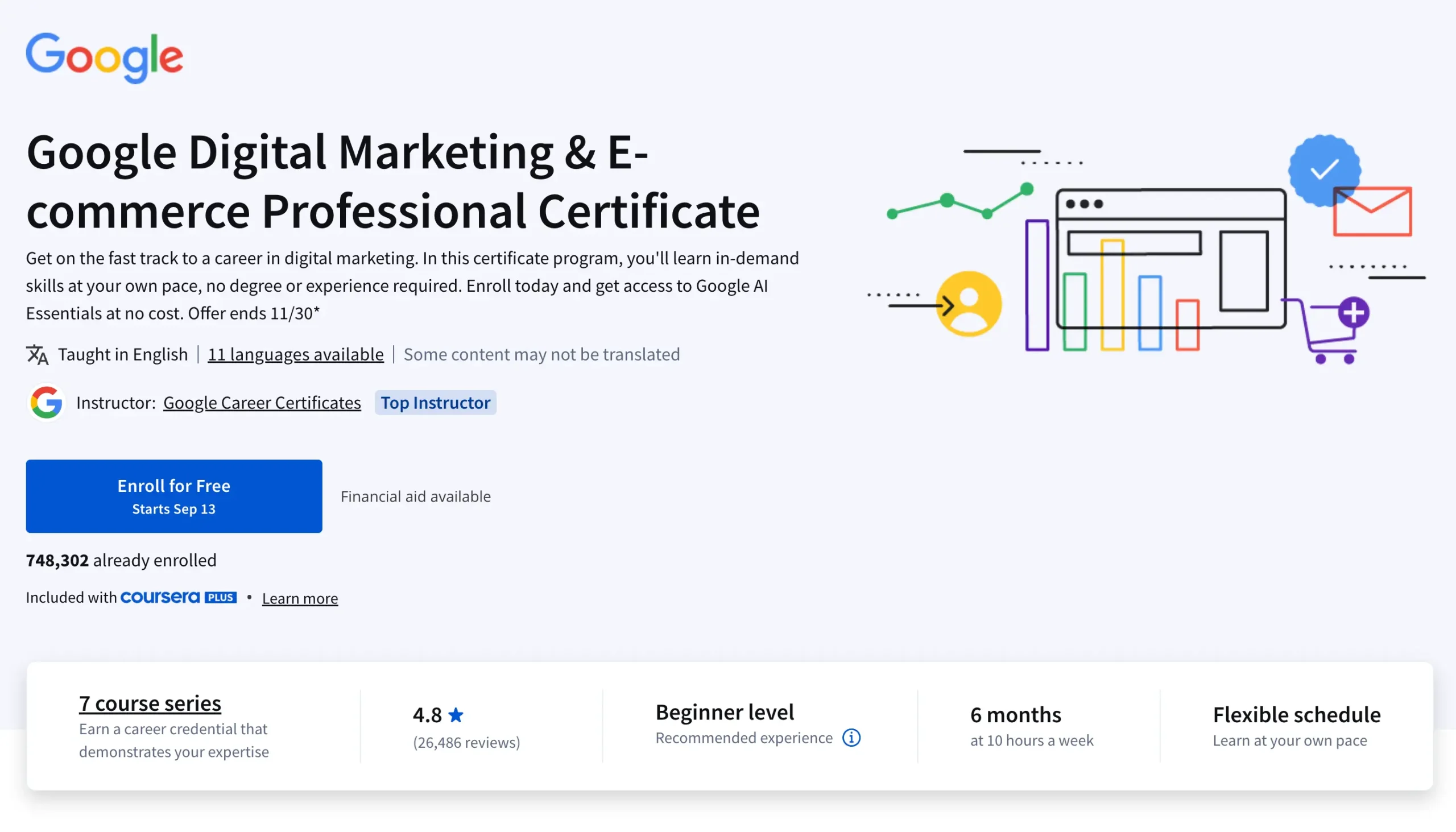 This is a great option if you want a Google Digital Marketing and a Google eCommerce Certification but have no prior experience or a related digital marketing degree.