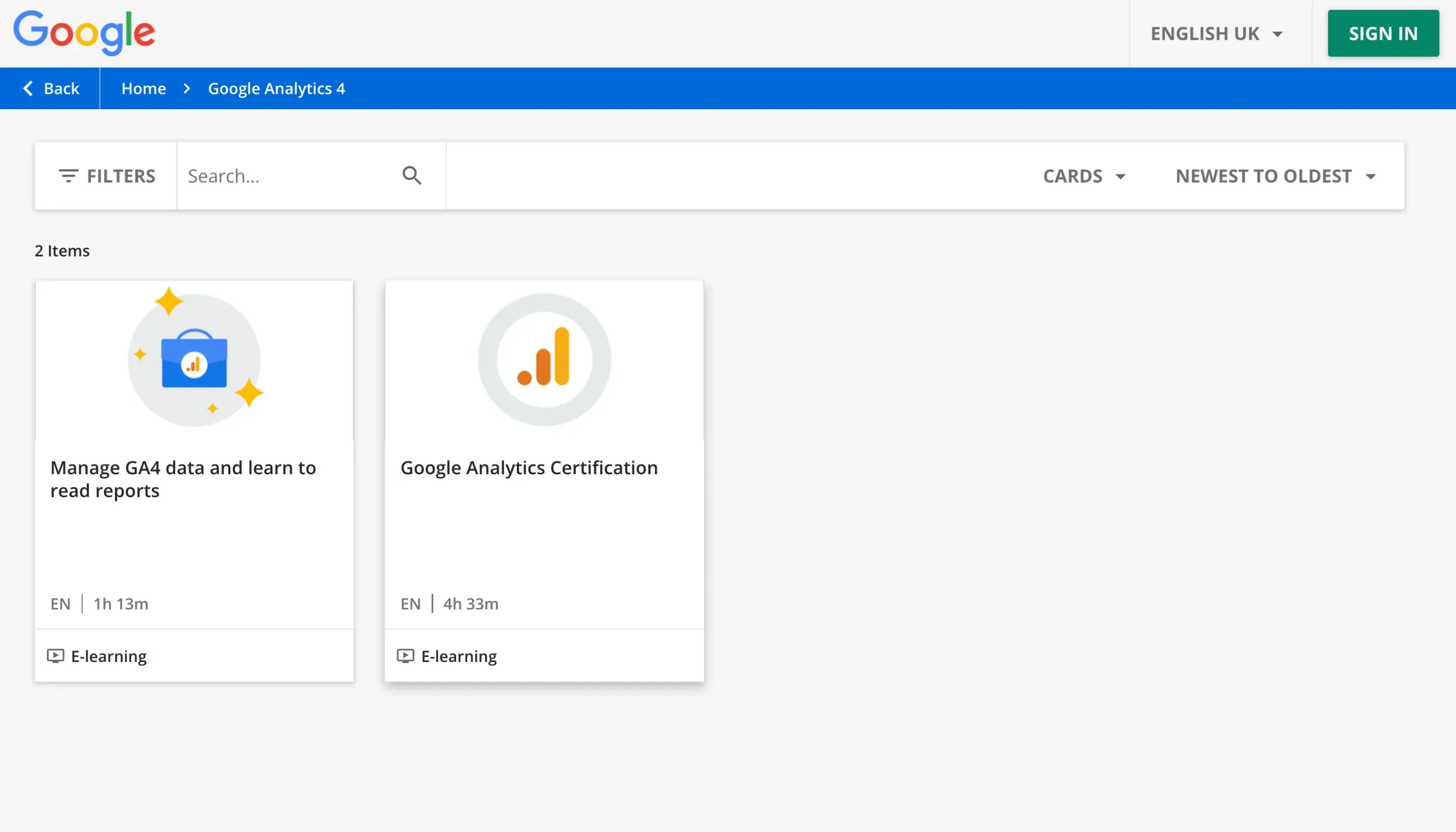 | Google Analytics 4 Certification | Learning GA4 and analytics skills. | Free | 4 hours |
