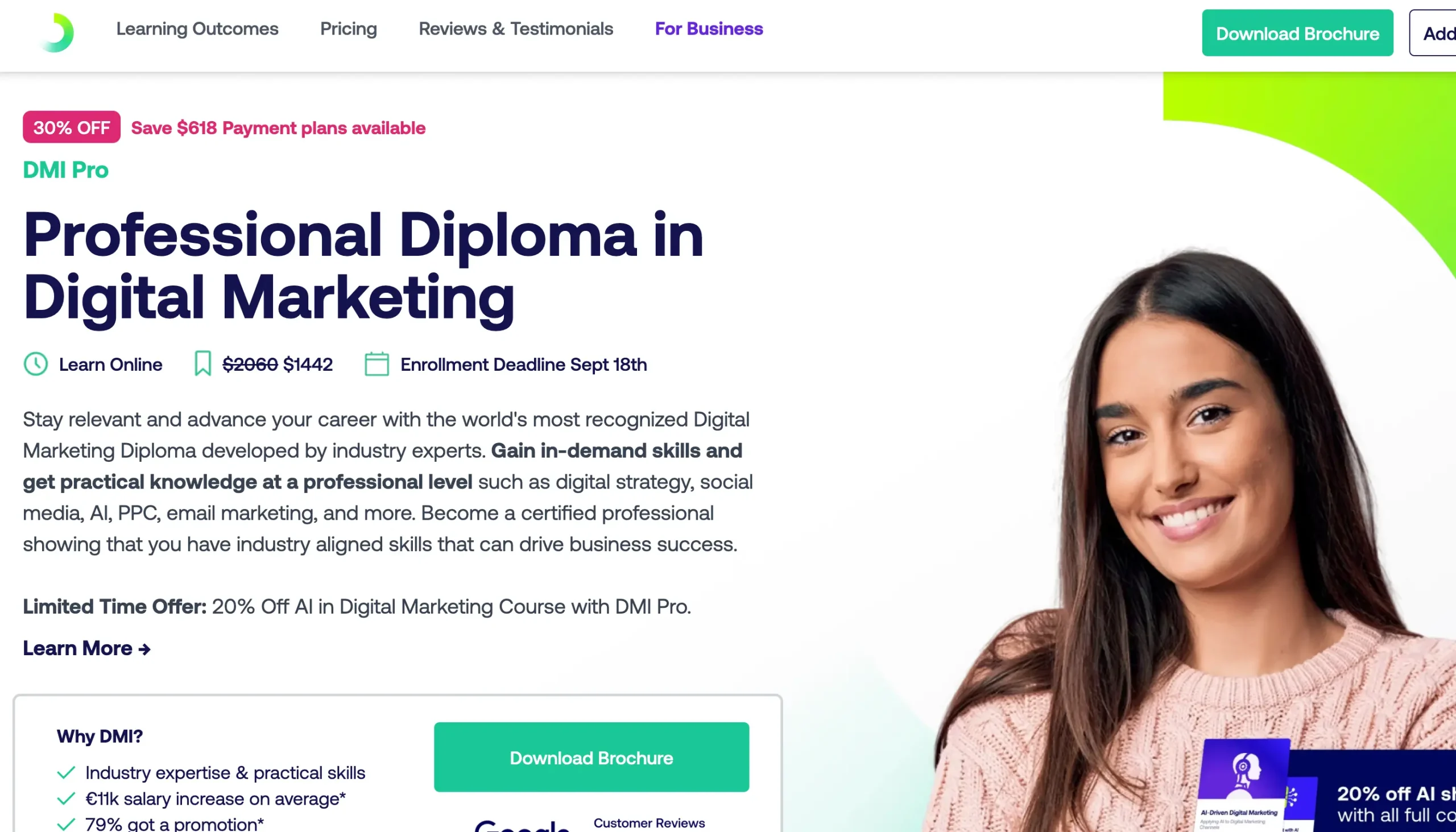 | Digital Marketing Institute DMI Pro Certification | Small business owners and startups. | $1,442 | 2 months |