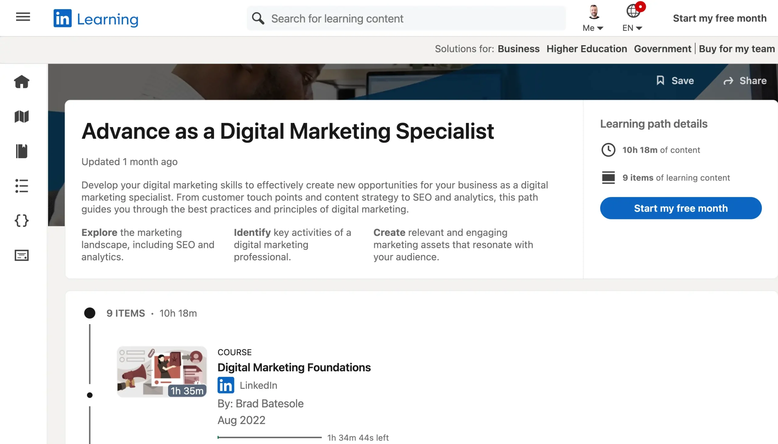 | LinkedIn Advance as a Digital Marketing Specialist | Intermediate learners who prefer short courses. | $29/mo | 10 hours |