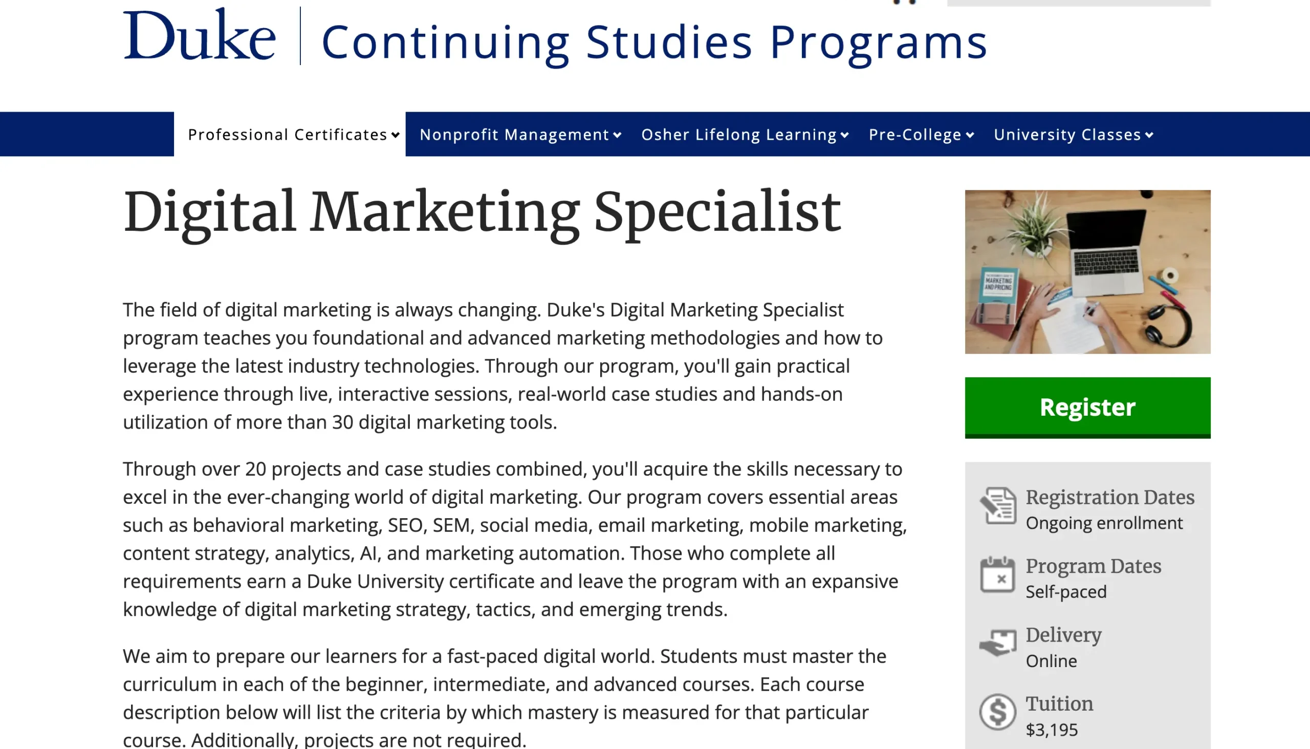 | Duke University Digital Media and Marketing Certificate | Students who want live interactive sessions. | $3,195 | 6 months |