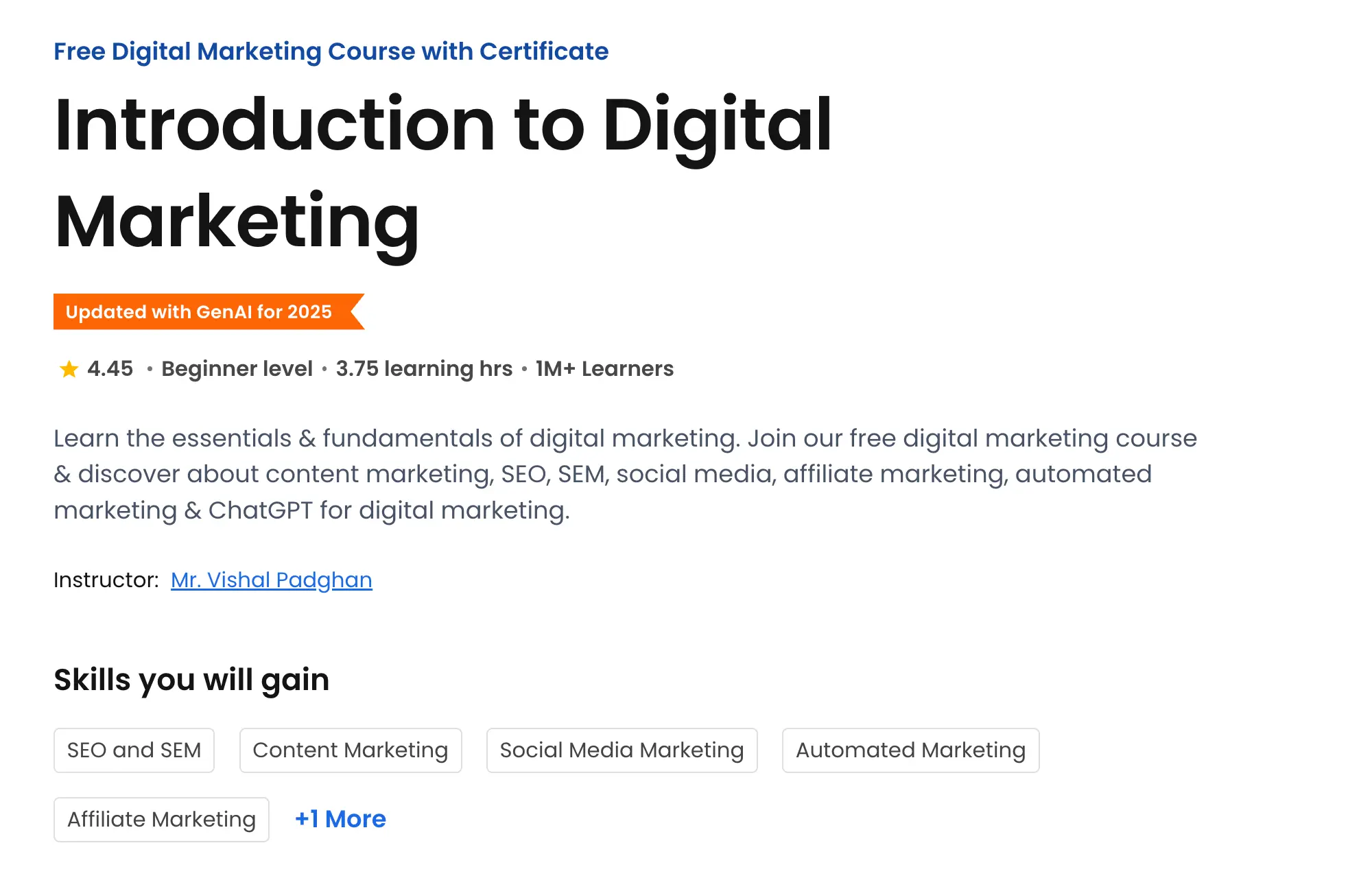 The Introduction to Digital Marketing by Great Learning is a short course that introduces SEO, social media, paid advertising, and analytics in a simple, beginner-friendly way. It’s ideal for people who want a fast overview before committing to deeper study.