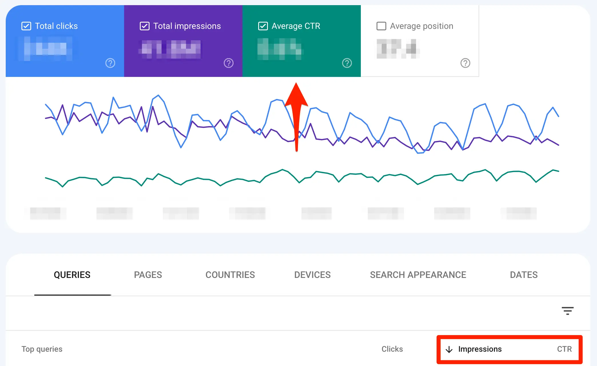 Log in to your Google Search Console and view the Performance on Search Results report. Click on the Average CTR tab and look for search queries with high impressions but low CTR.