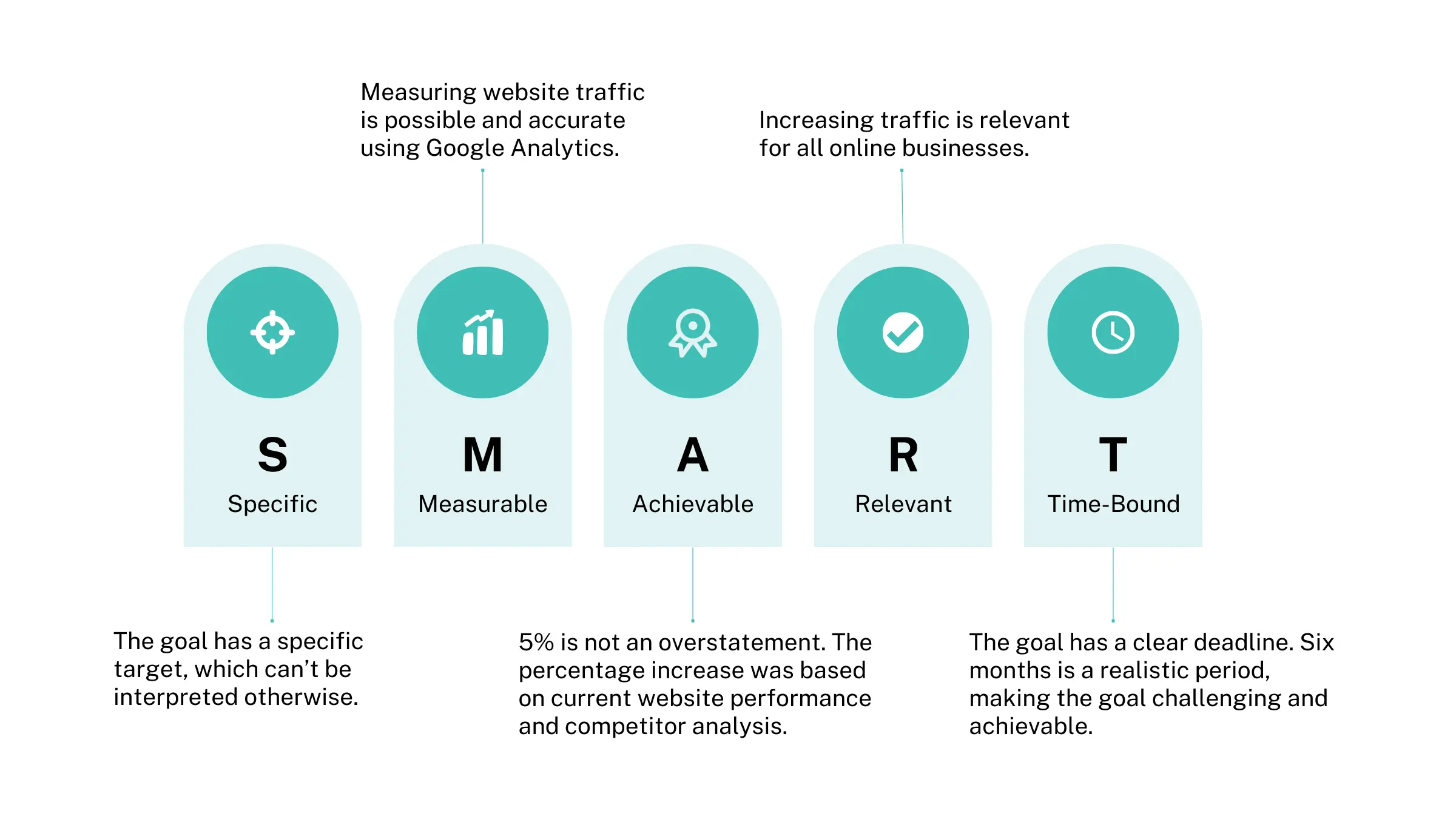 Here is an example of a SMART GOAL: Increase your website's organic traffic by 5% in 6 months.