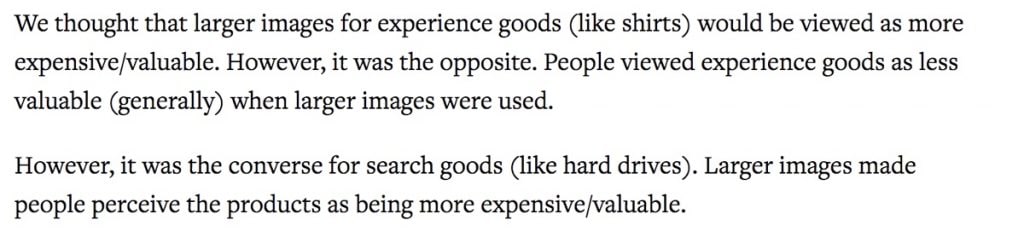 Image size does matter – A recent study by CXL, tested different image sizes for different types of products, and they concluded that larger images for experience goods (like t-shirts) made the products perceived as less valuable, while for search goods (like hard drives), they perception by users was that they are more valuable.