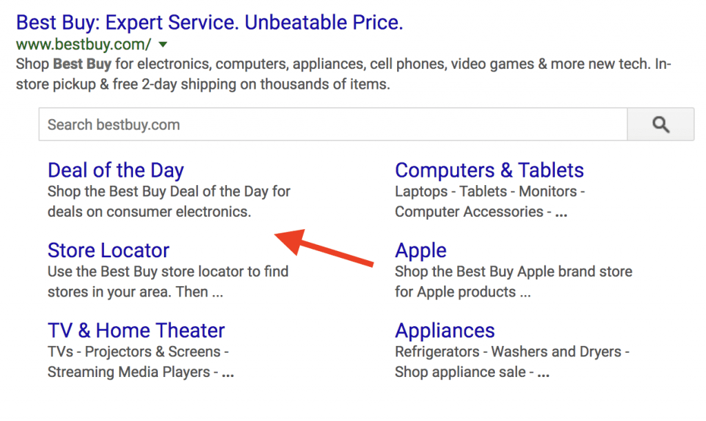 In the case of an ecommerce store, sitelinks will show your main categories, like this example from Best Buy.