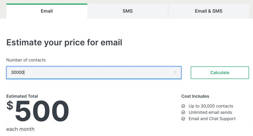 Let’s say you use Mailchimp as your primary marketing platform and have a list of 30K subscribers. Your monthly cost will be $326.