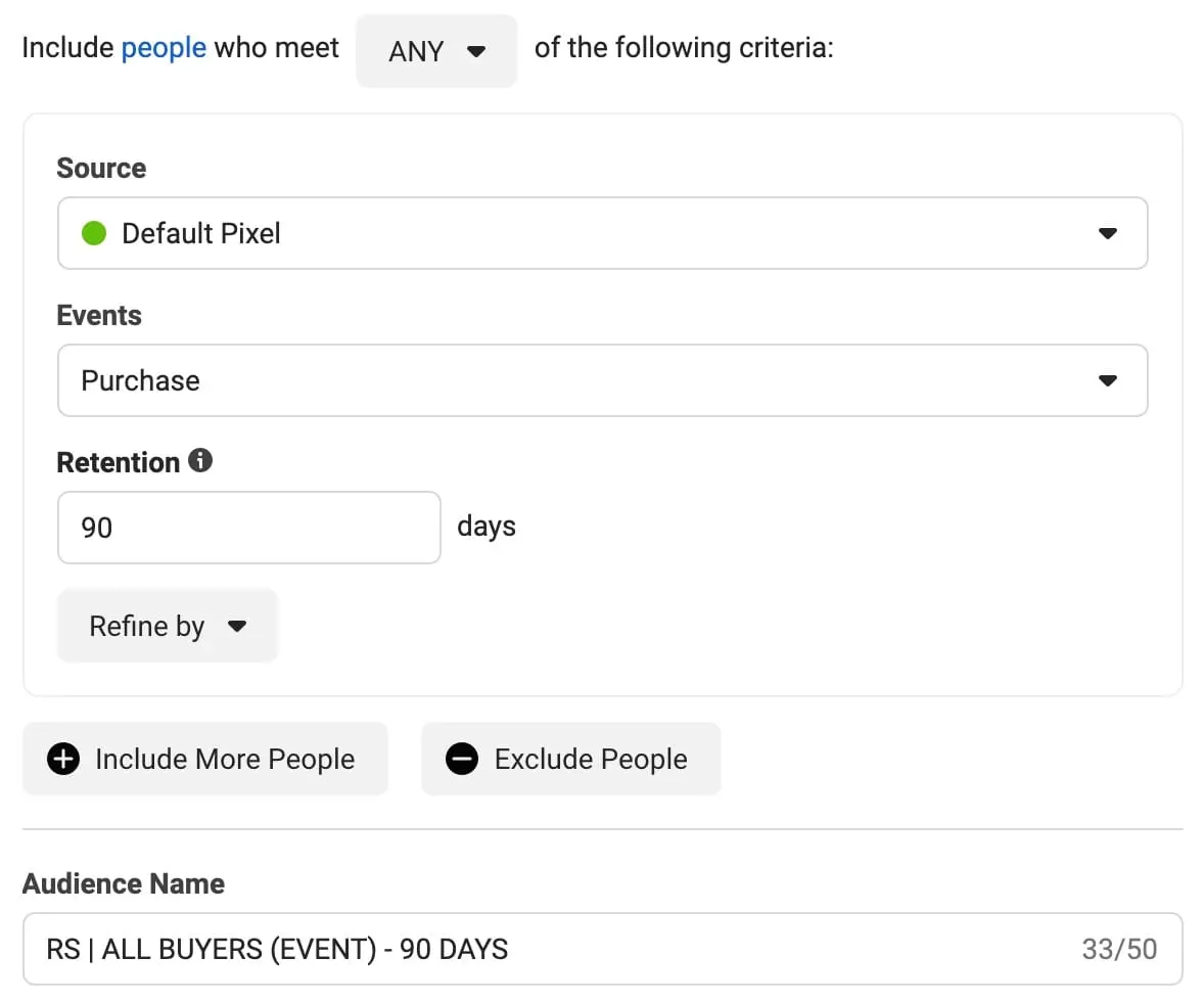 2. The “All Buyers (Event) - 90 Days” - this audience will include all people who purchased a product from our website for the last 90 days. This is how the rules for this audience look: