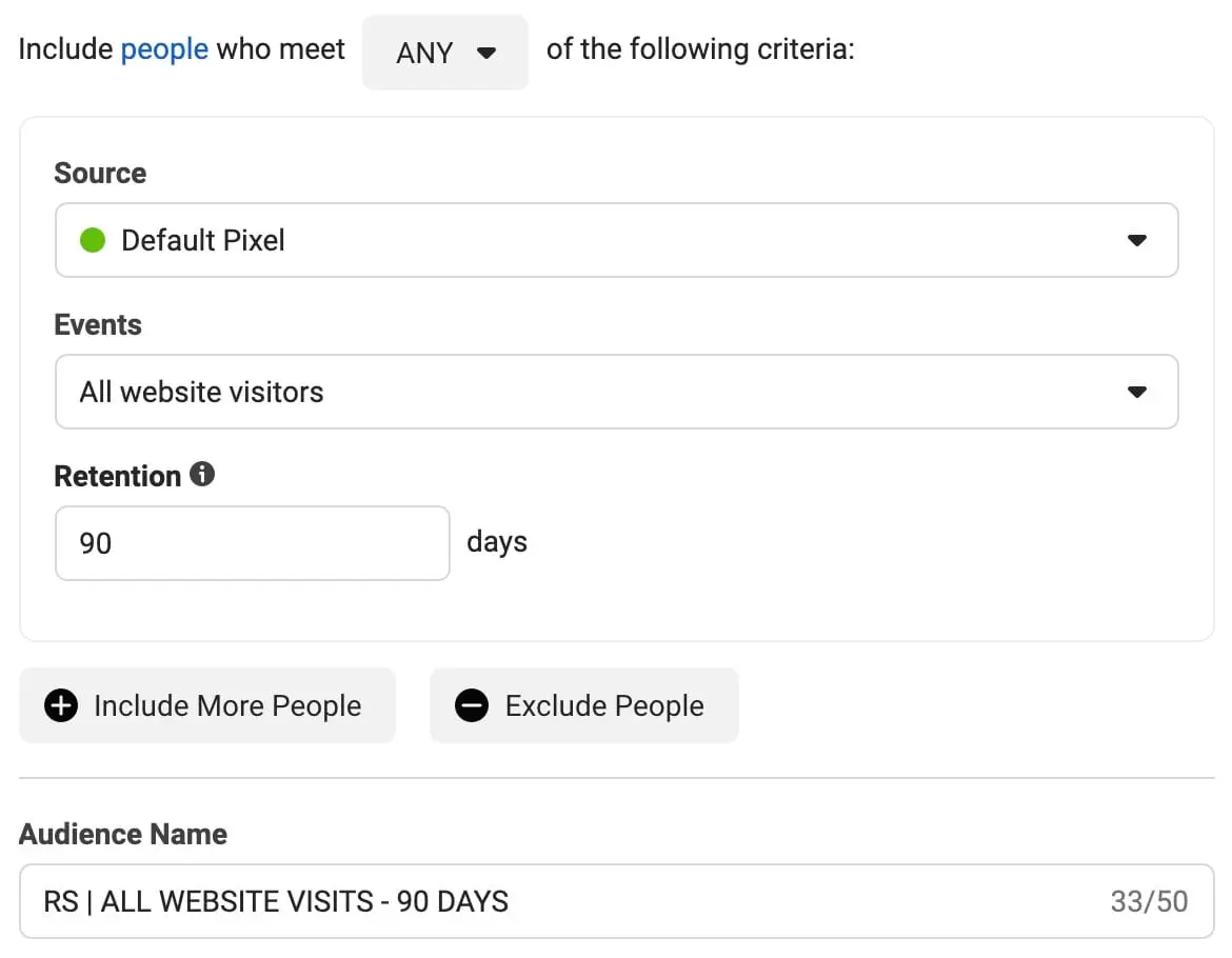 1. The “All Website Visits - 90 Days” - this audience will include people who visited any page on our website for the last 90 days. This is how the rules for this audience look: