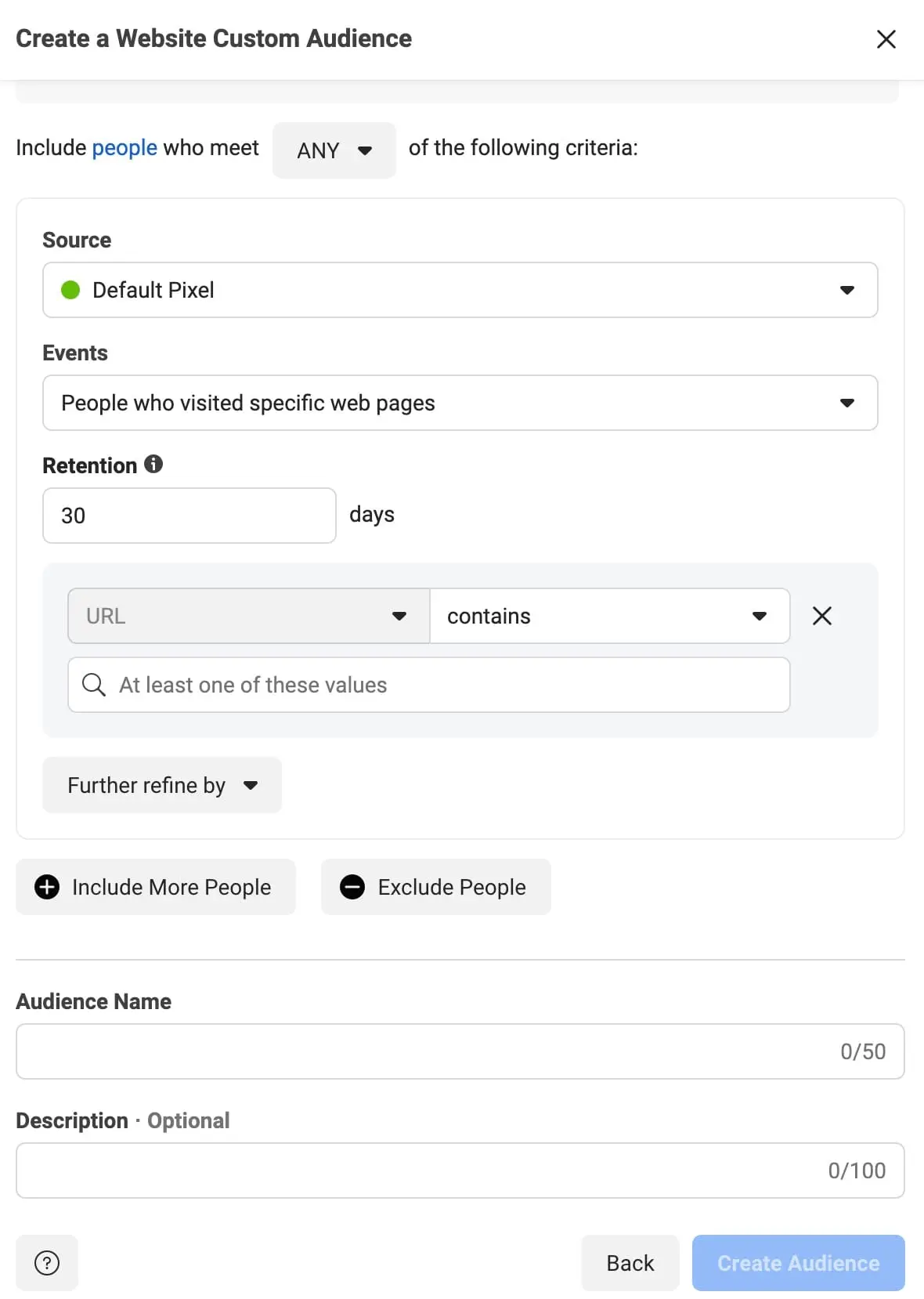 Equals – Here’s an example of how you could use this: If you want to target ads to people who have visited a specific web page (maybe one that indicates strong intent to purchase, like the confirmation page for signing up for product update emails), you could create an audience of people who’ve visited that specific URL.