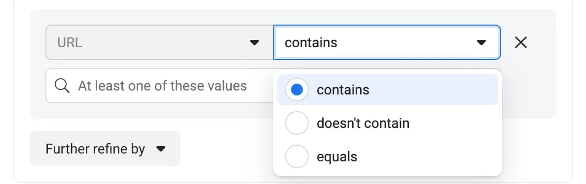 Contains - Here’s an example of how you could use this: If you sell clothes on your website and want to create an audience of people who’ve looked at summer clothes, you could have it consist of people who visited URLs that contain “summer.”