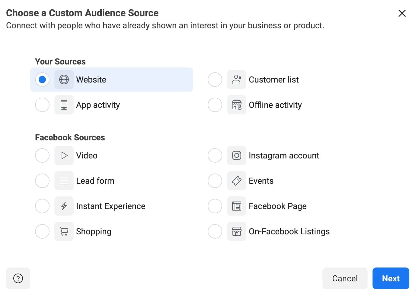 For the purpose of this tutorial, we’ll use the “Website” as the audience source. You can create an audience based on a different source depending on your business type.