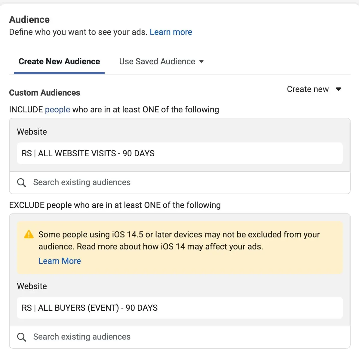 We are excluding the “All Buyers—90 Days” audience to show our retargeting ads to people who have not yet completed a purchase. There is no reason to retarget people who have already converted.