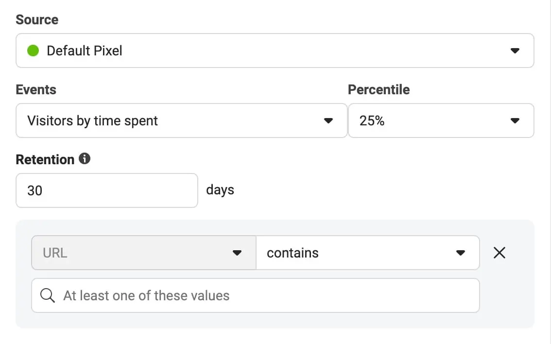 Visitors by time spent - You can create an audience of your top 5%, 10%, or 25% visitors based on their time spent on your website. The higher the value, the more likely these people are to engage with one of your retargeting ads.