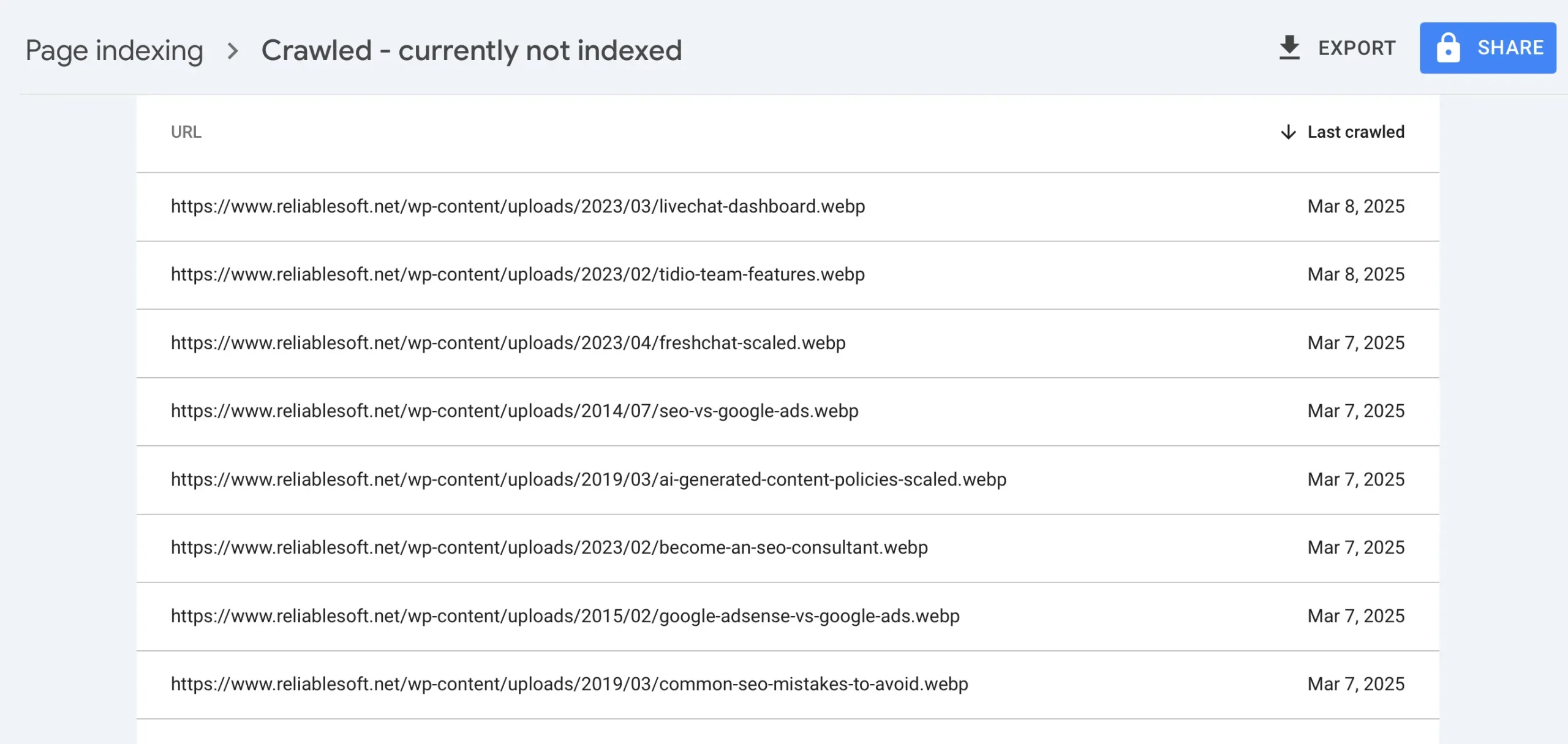 If you notice .webp images listed in this report, don’t worry, this is normal. Google sometimes crawls image URLs separately, but since images aren’t standalone web pages, they won’t be indexed like regular content. You can safely ignore them.