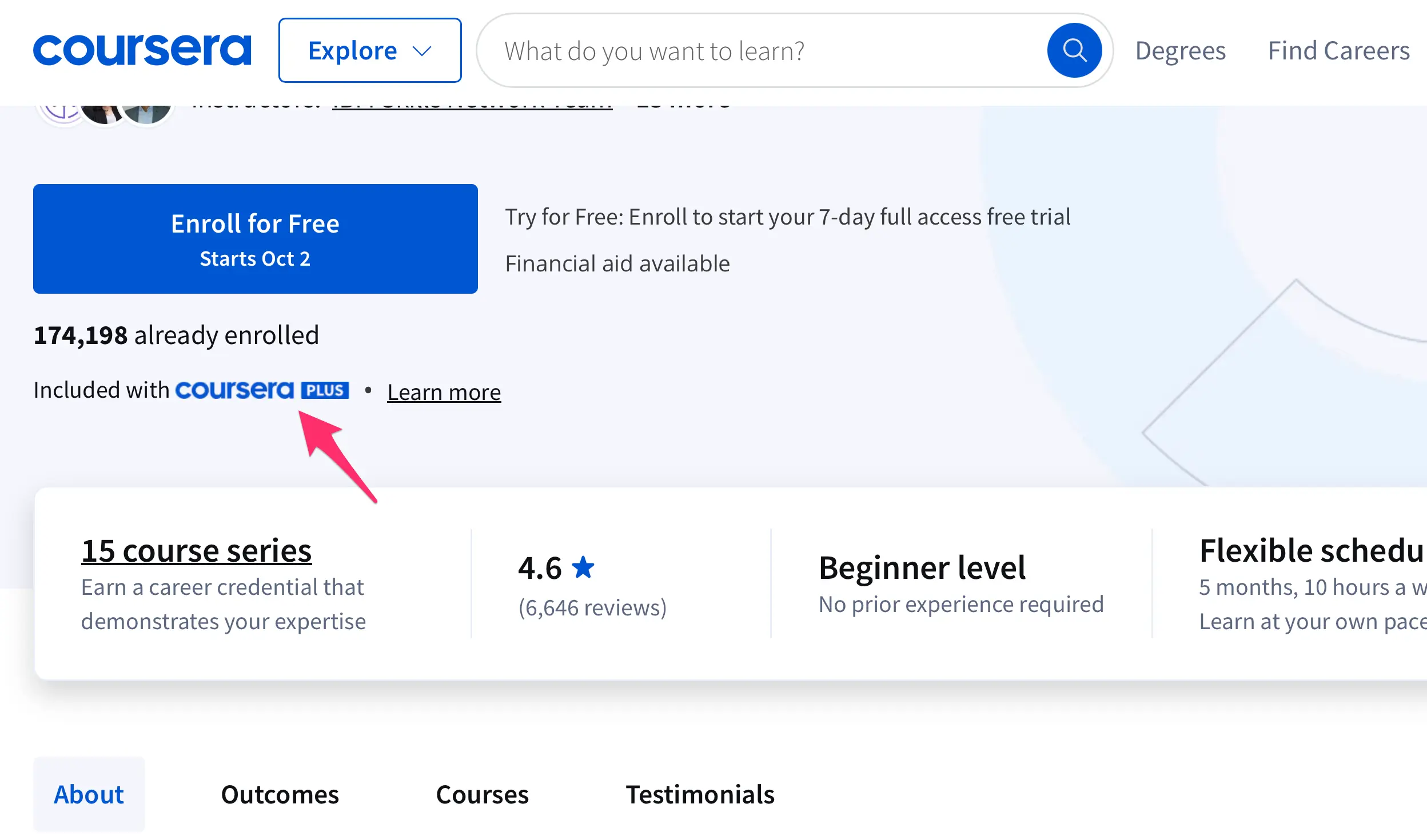 Courses that are part of Coursera Plus have the words "Included with Coursera Plus" below the registration button (as shown here).